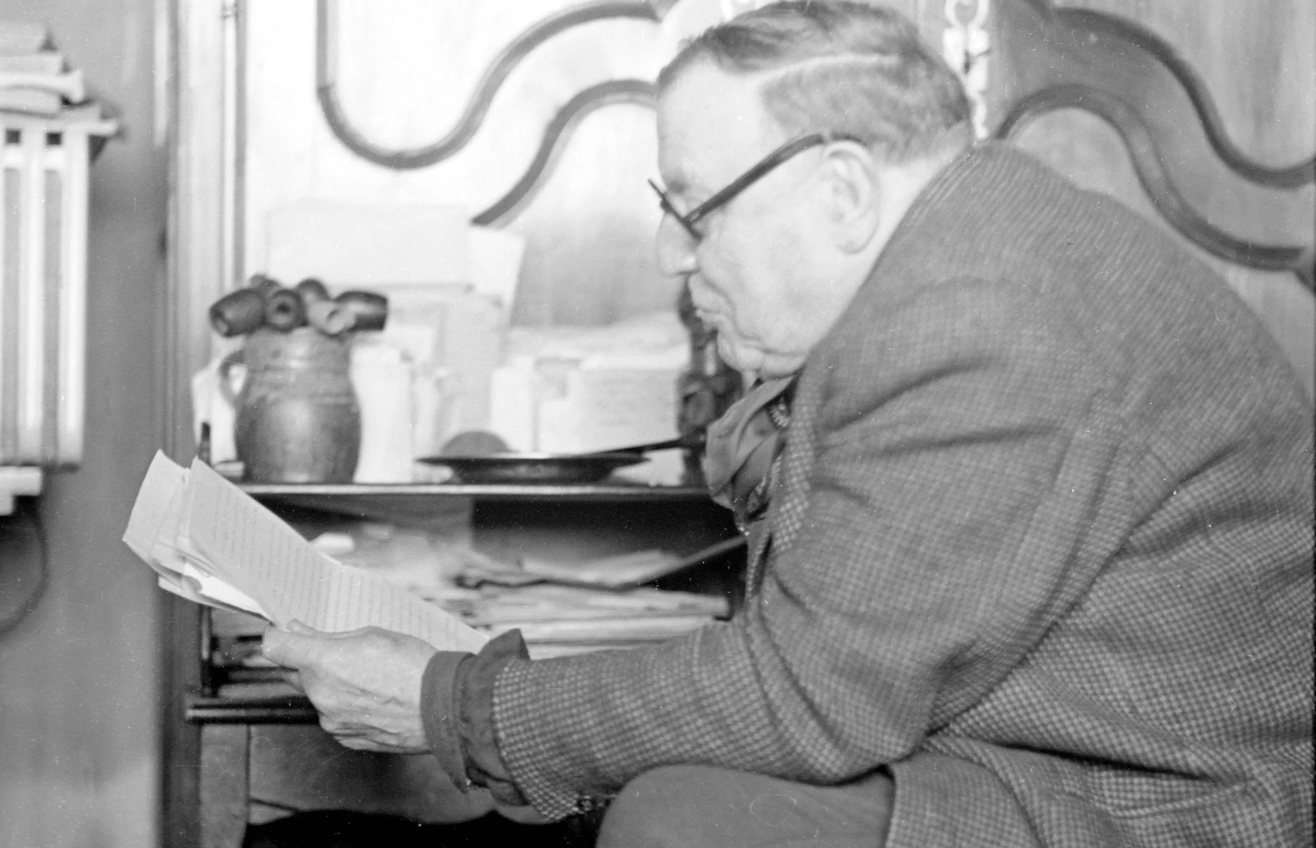 Black and white photograph of a heavyset man in a plaid jacket reading a stack of papers, leaning forward in profile, with a wooden sideboard behind him