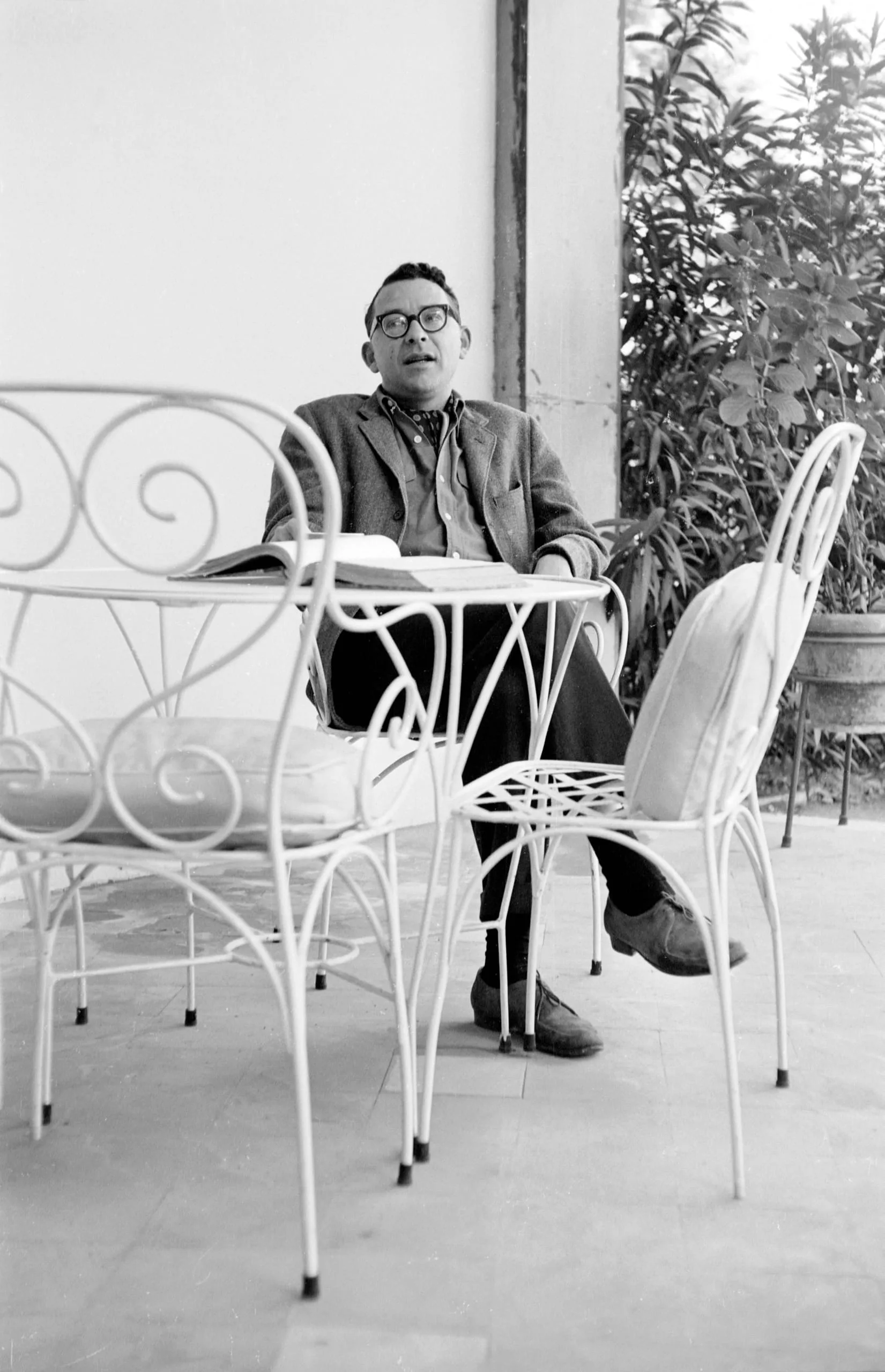 Black and white photograph of a man in glasses and a blazer seated at a wrought iron café table on a tiled patio, gazing upward