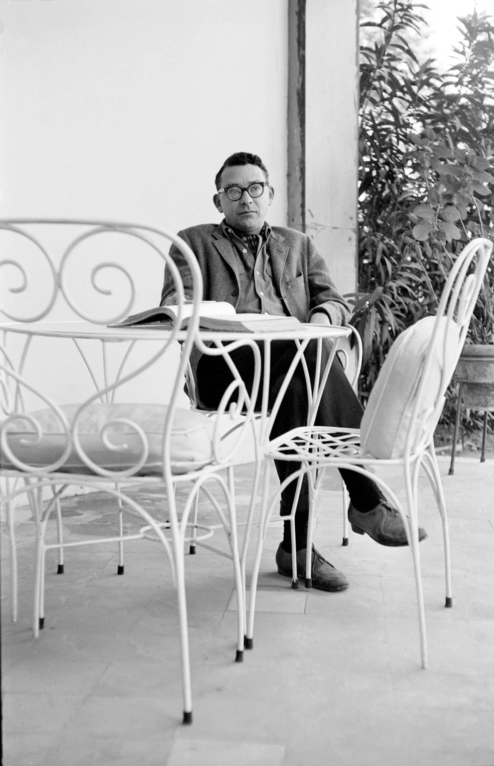Black and white photograph of a man in glasses and tweed jacket seated at a white wrought-iron table on a patio, one leg crossed, looking directly at the camera