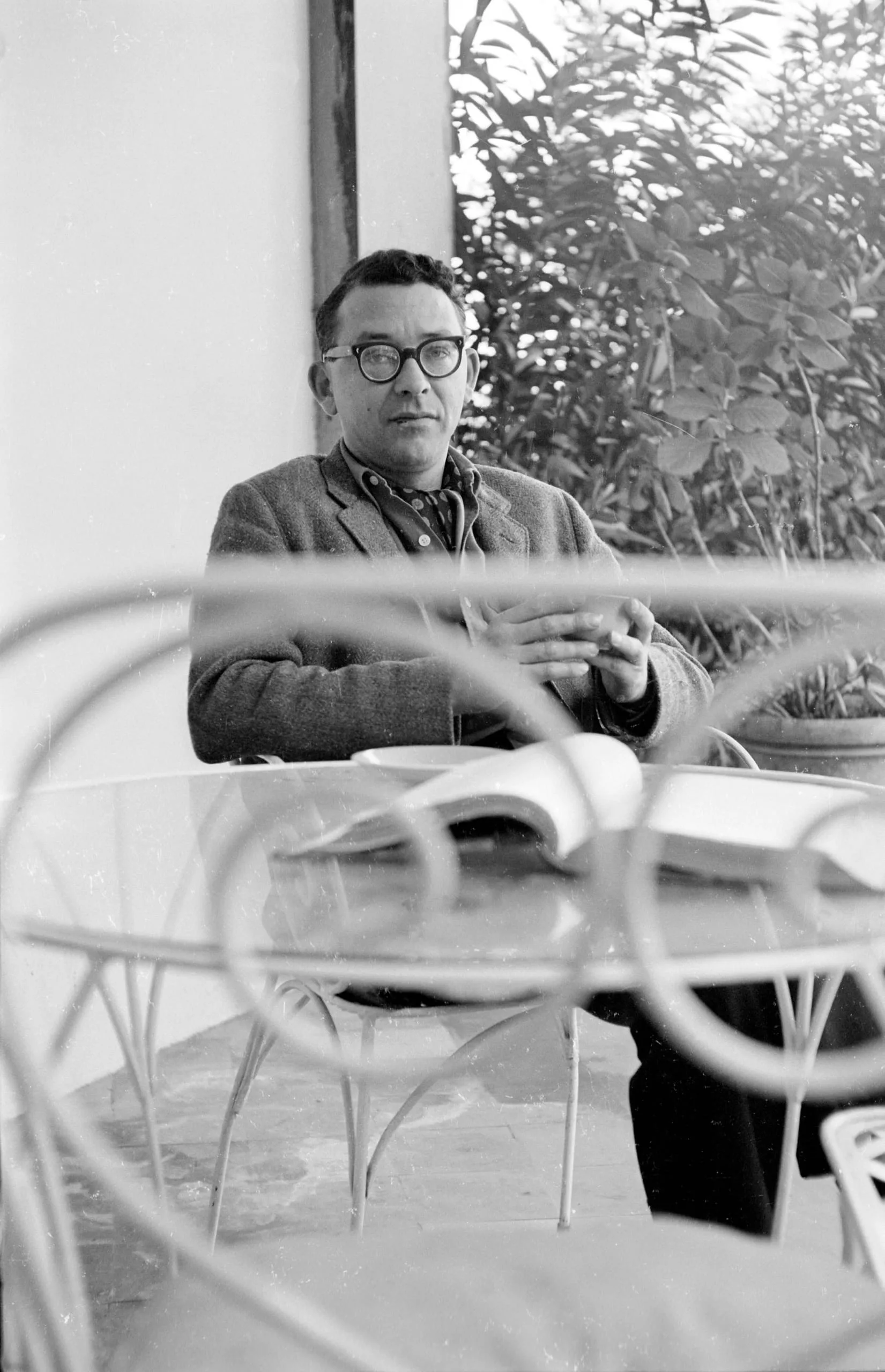 Black and white photograph of a man in glasses and a tweed jacket seated at a glass table on a patio, shot through out-of-focus wire furniture in the foreground