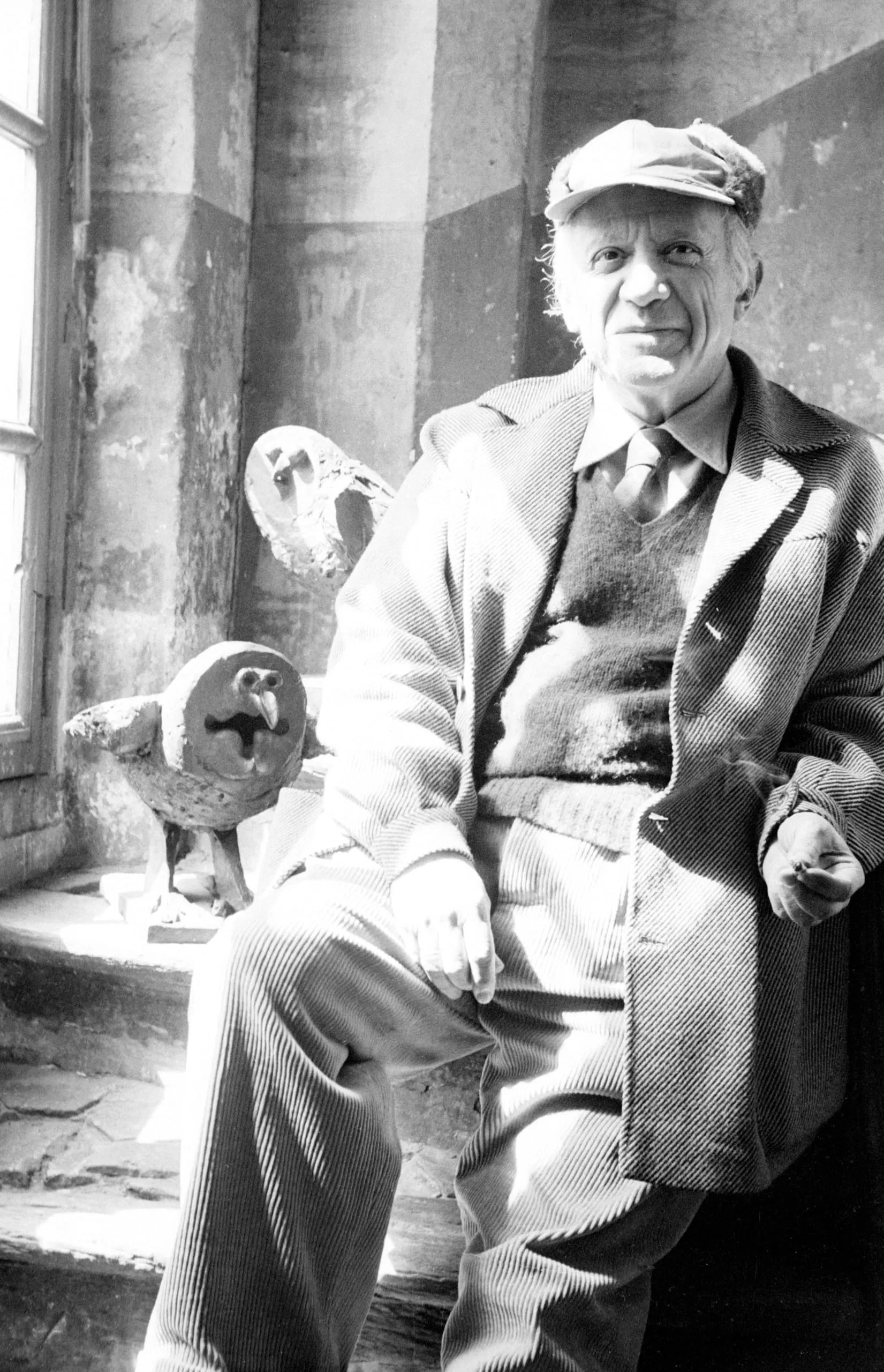 Black and white photograph of an older man in a flat cap and corduroy trousers seated on a stone ledge, with a rough-textured ceramic bird sculpture beside him