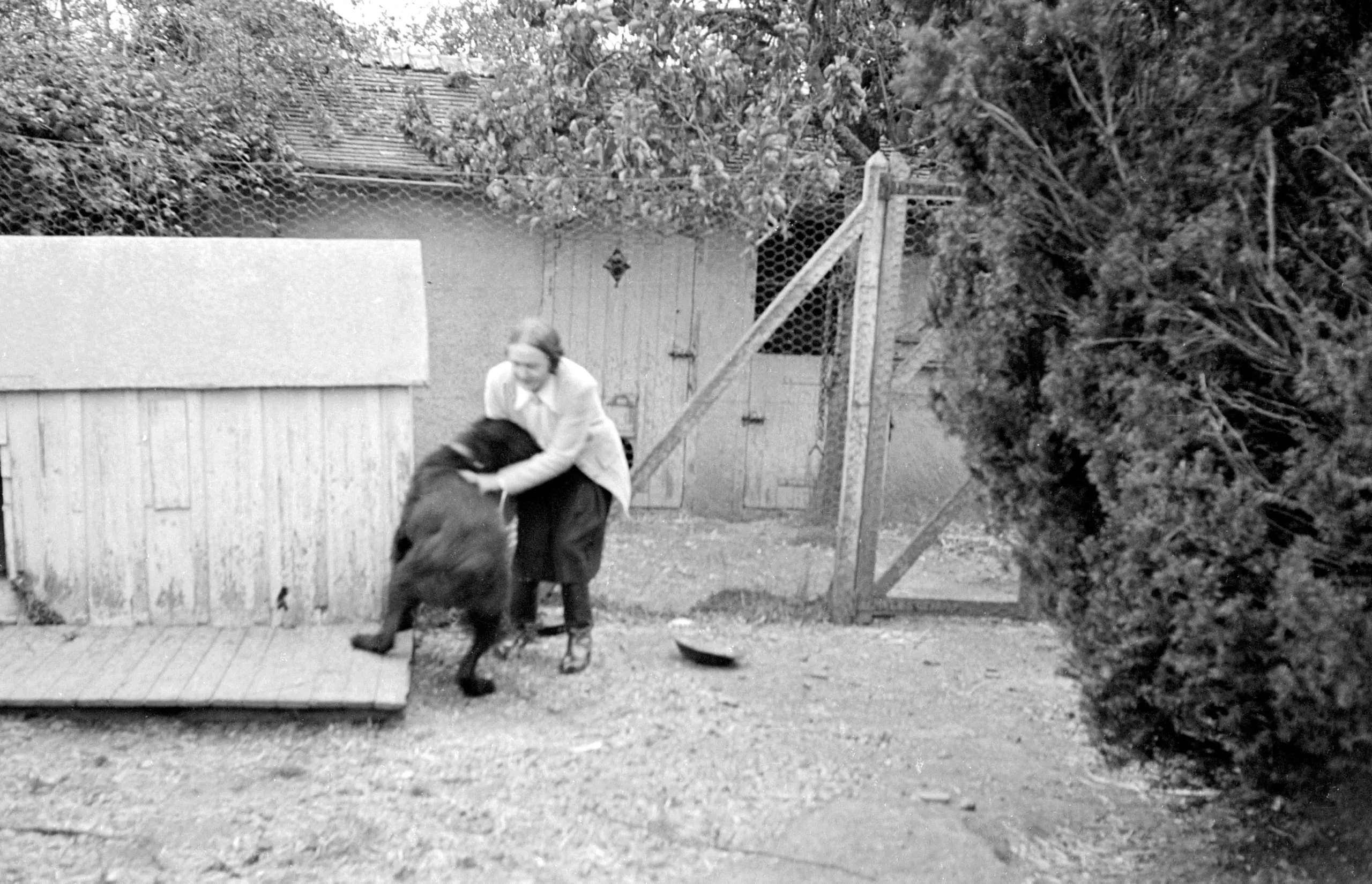 Black and white photograph of a person hugging or wrestling with a large black dog in a backyard, with a wooden shed and wire gate visible behind them