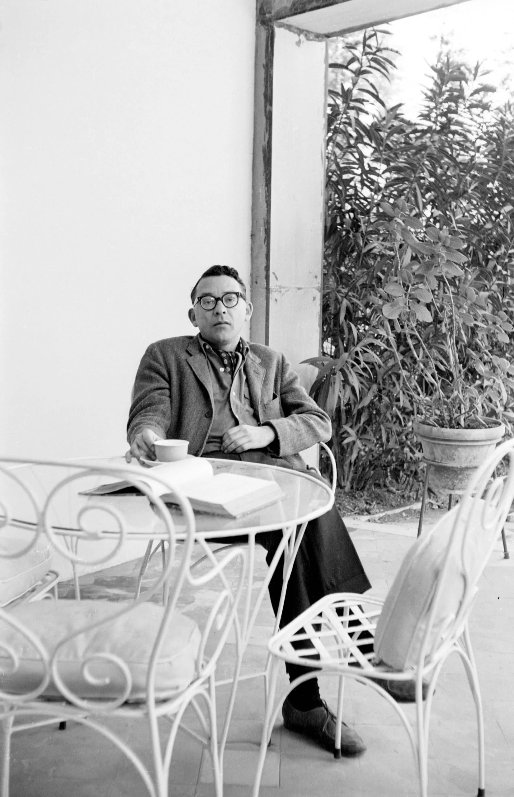 Black and white photograph of a man in glasses and a sport coat seated at a white wrought-iron table on a patio, with an open book and cup before him