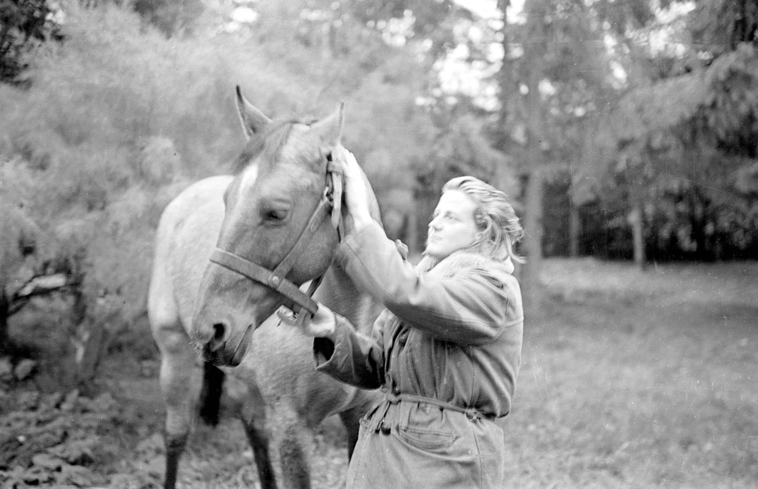 Black and white photograph of a person in a belted work jacket stroking the head of a pale horse outdoors, trees softly out of focus behind them