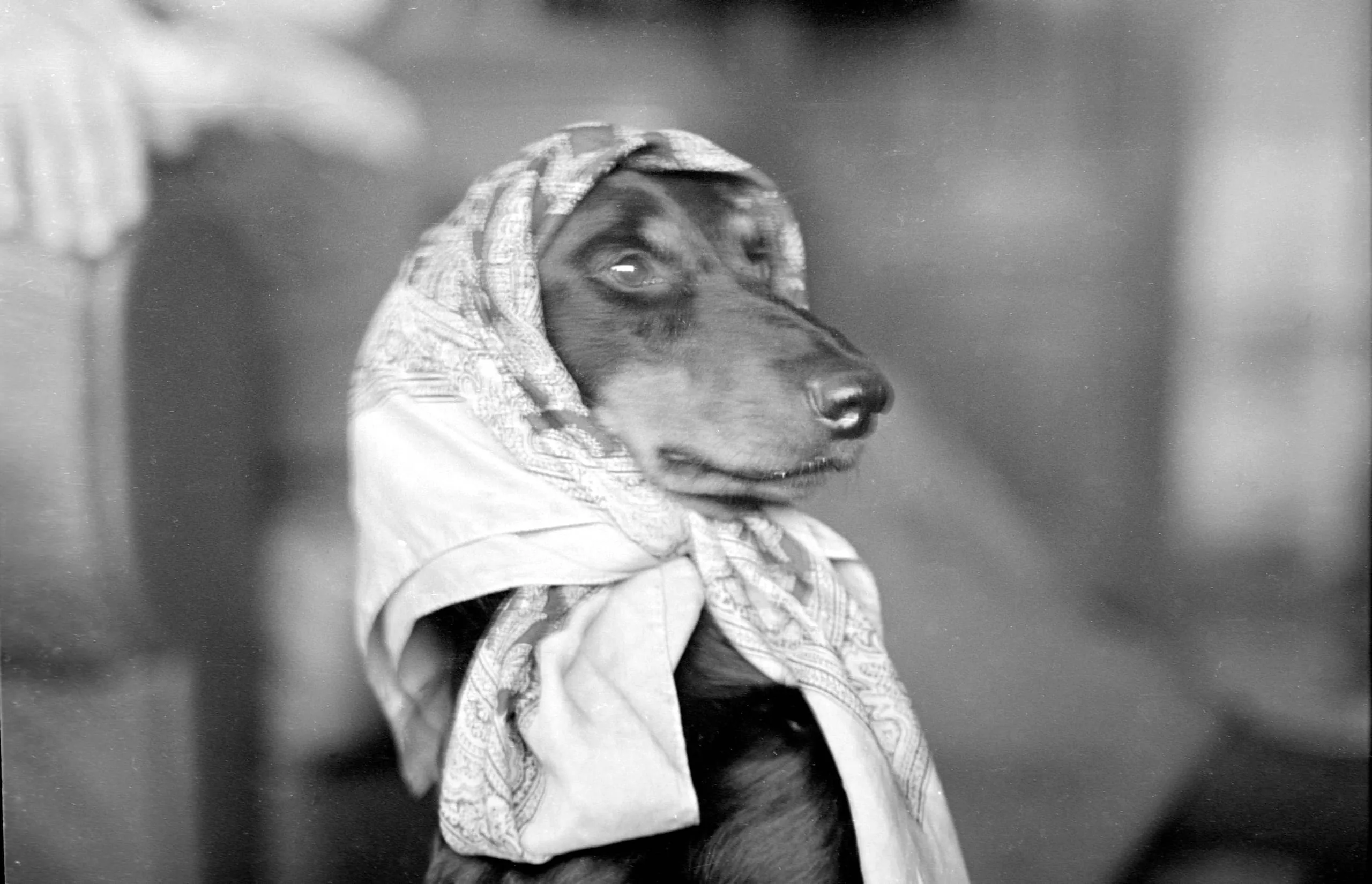 Black and white photograph of a dachshund wearing a patterned kerchief tied under its chin, shown from the chest up in profile