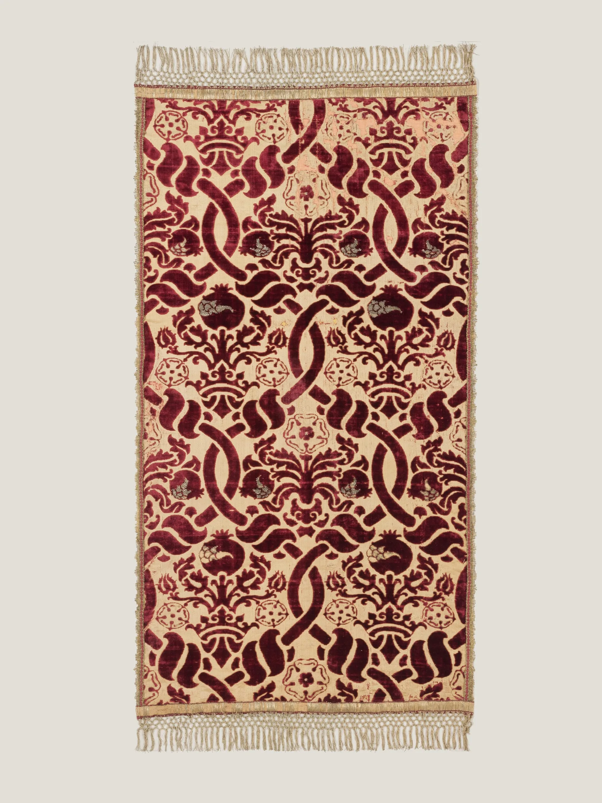 - Silk cut and metallic uncut velvet on silk satin ground with silk- and metallic-thread passementerie and knotted fringe
