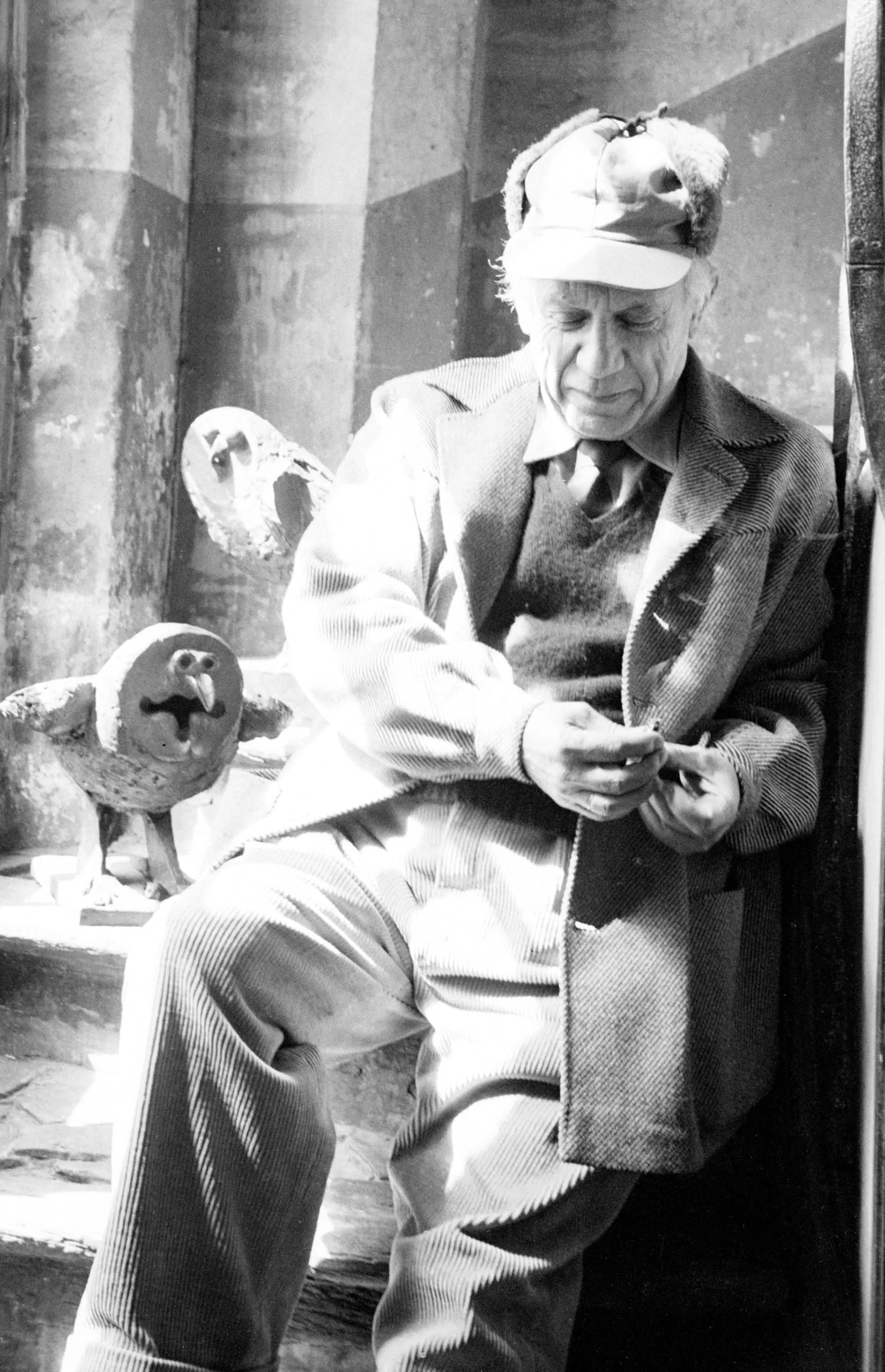 Black and white photograph of an older man in corduroy suit seated, holding a small object, with ceramic bird sculptures nearby and a bird figurine perched on his cap