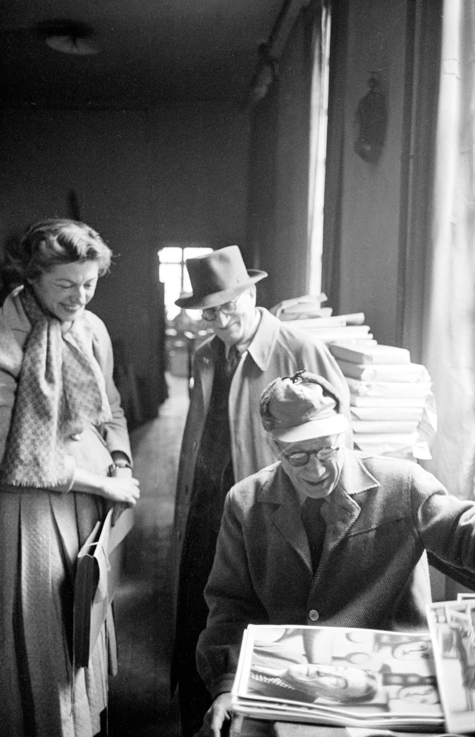 Black and white photograph of three people gathered around a table covered with large printed sheets in a narrow interior room, stacks of materials piled along the wall behind them