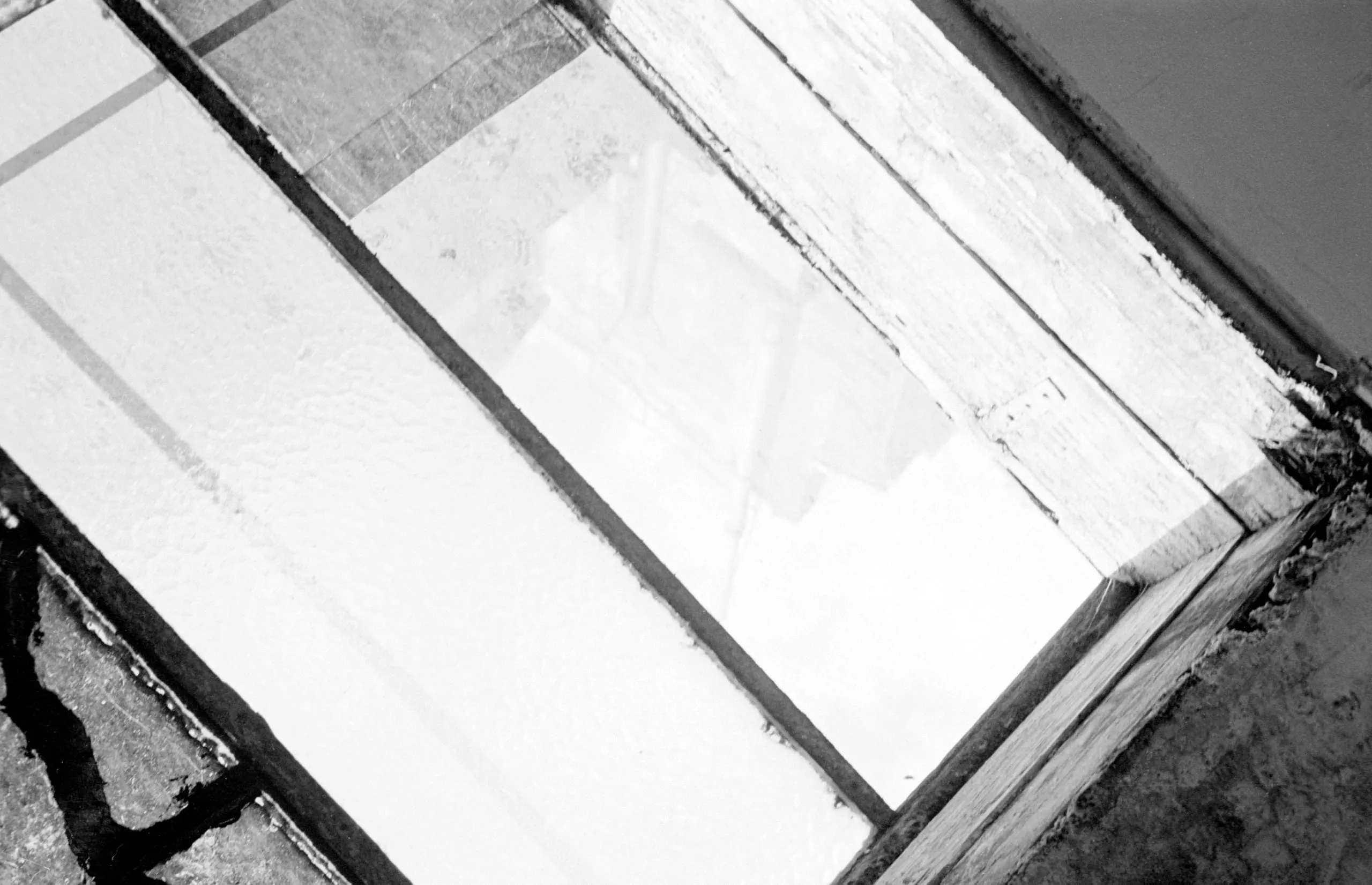 Aerial black and white photograph of rectangular flat basins or panels divided by narrow dark borders, viewed from directly above