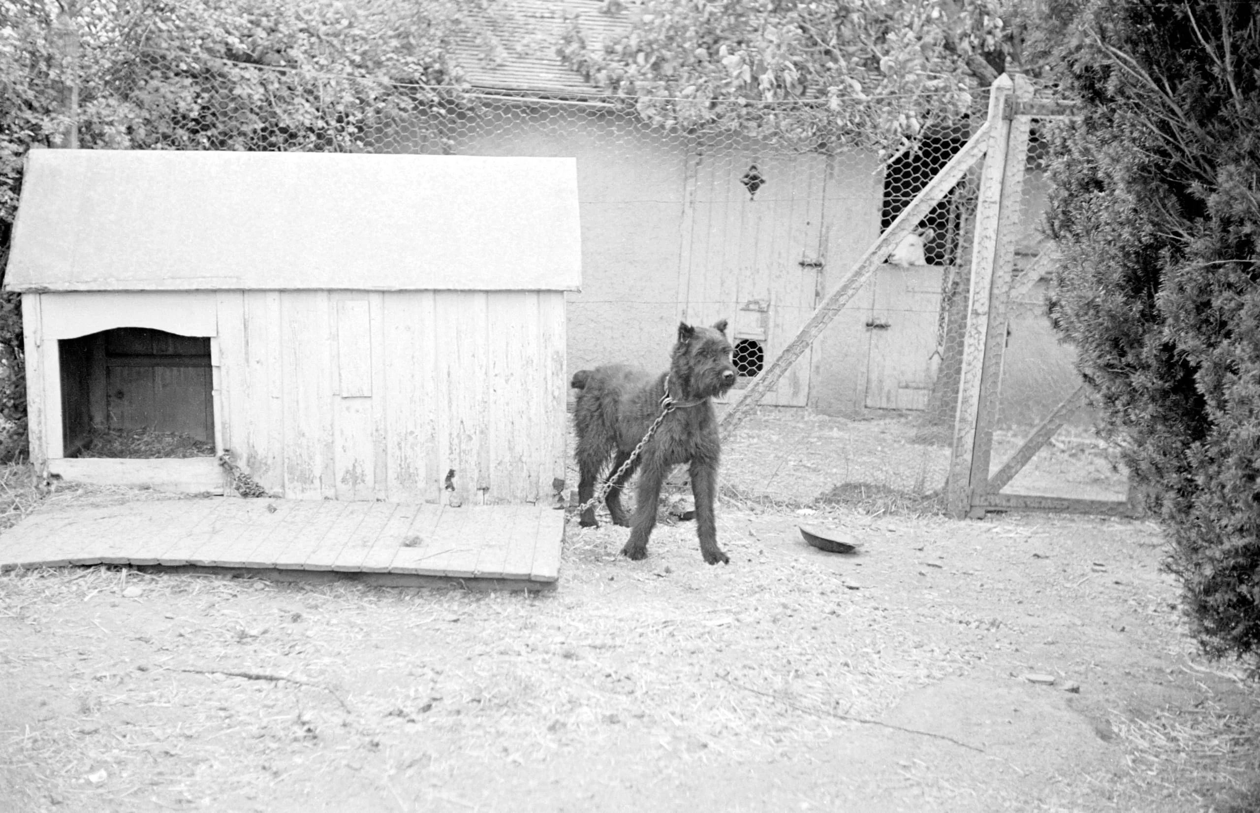 Black and white photograph of a shaggy, dark-coated dog on a chain standing in a dirt yard beside a small wooden doghouse