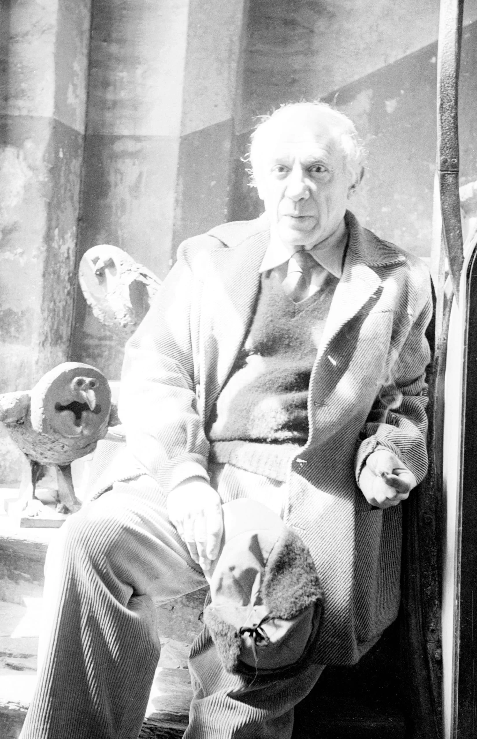 Black and white photograph of an elderly white man seated, wearing a textured blazer and dark tie, beside rough ceramic sculptural forms