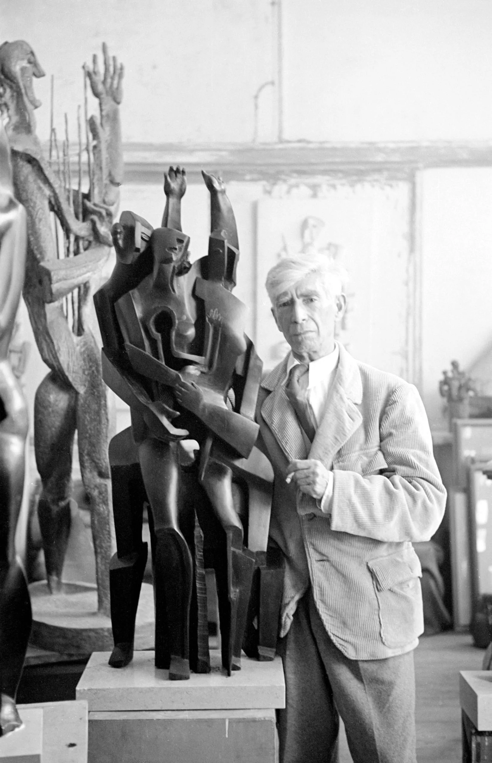 Black and white photograph of a gray-haired white man in a striped blazer standing among dark bronze abstract figurative sculptures in an artist's studio