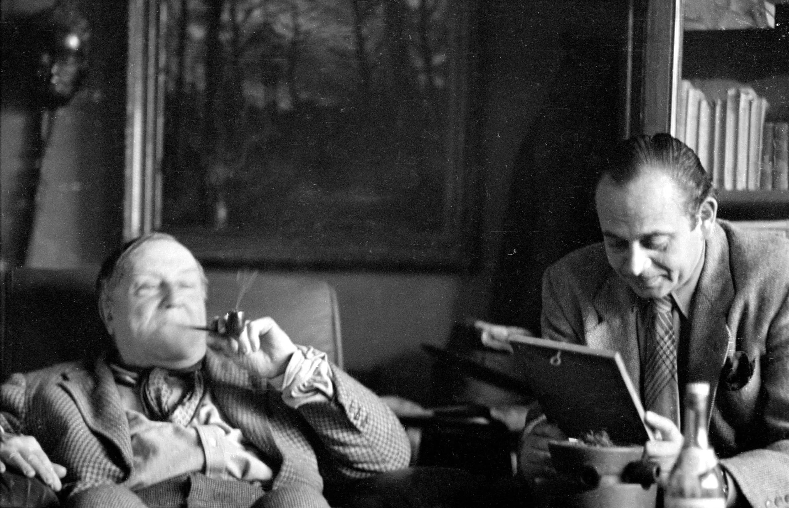 Black and white photograph of two men seated indoors; one reclines with a pipe in his mouth, the other leans forward looking at an open book or portfolio