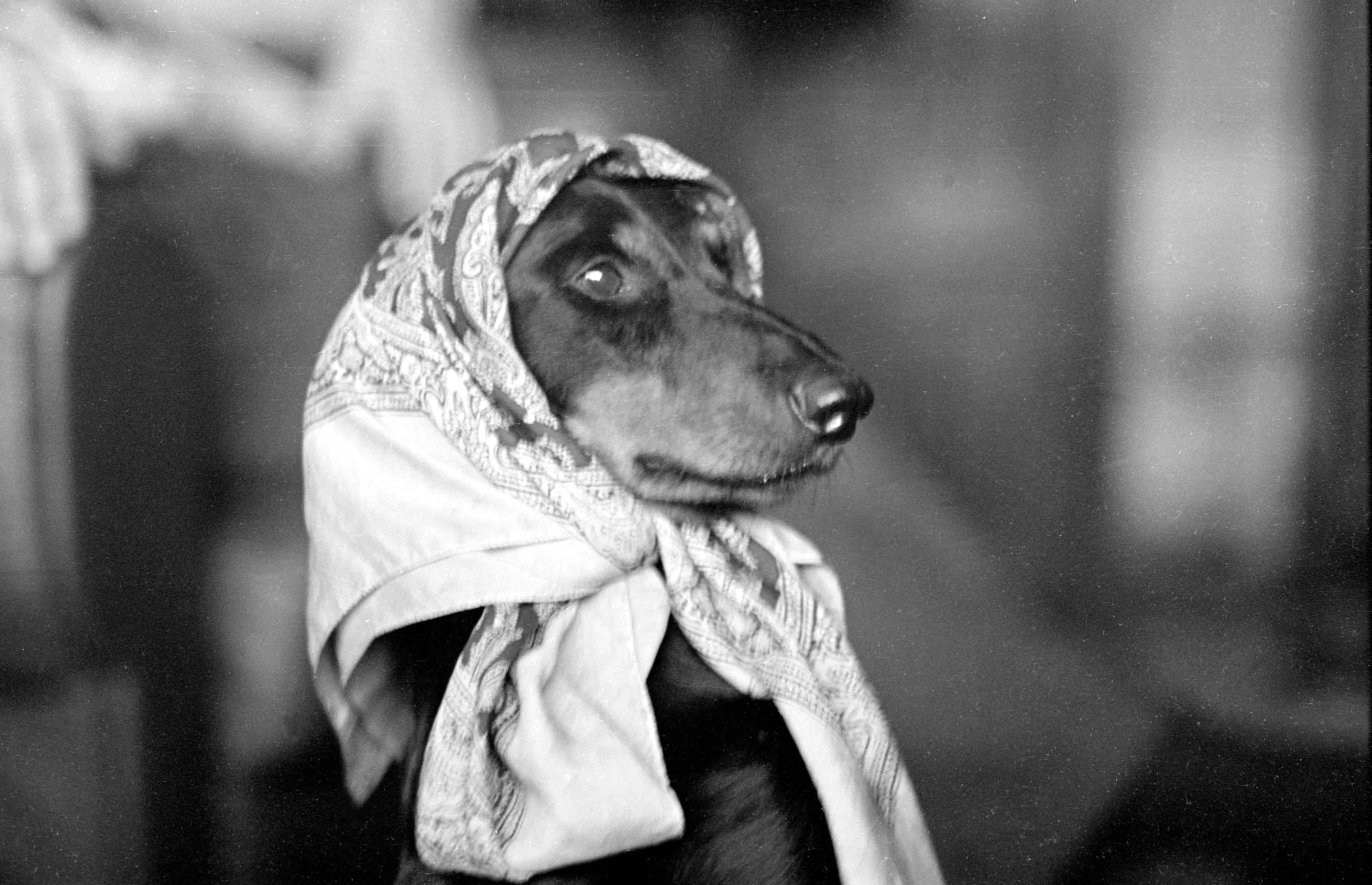 Black and white photograph of a dark-coated dachshund in profile, wearing a patterned cloth scarf draped over its head and tied at the neck, soft blurred interior background