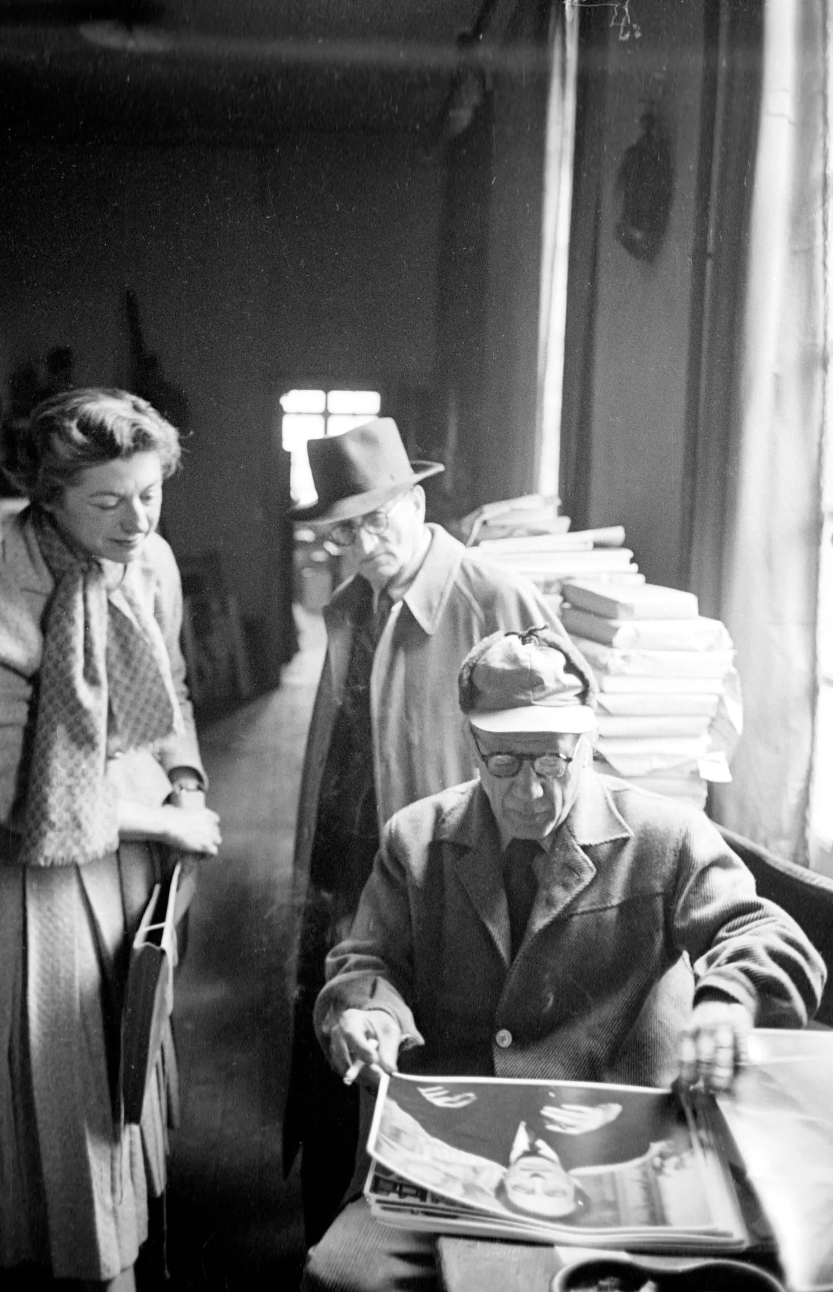 Black and white photograph of three people gathered around a table, one seated and examining an open book or portfolio, two others standing and looking on