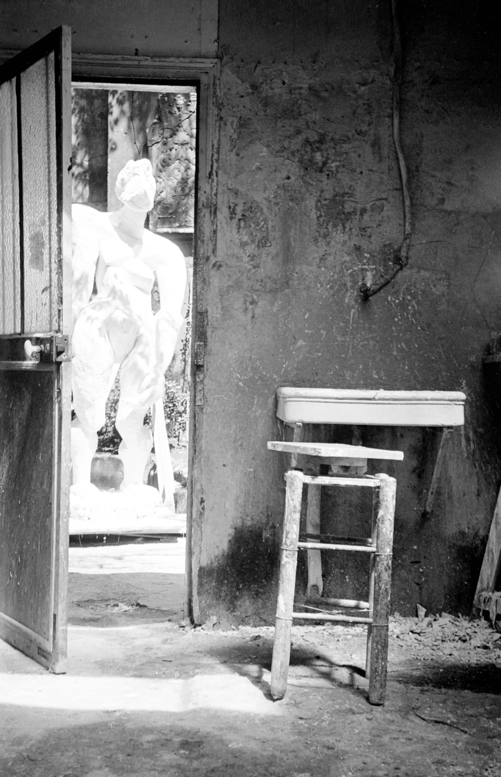 Black and white photograph of a weathered studio interior, with an open door revealing a large white figurative sculpture outdoors, and a powder-dusted wooden stool with a basin in the foreground