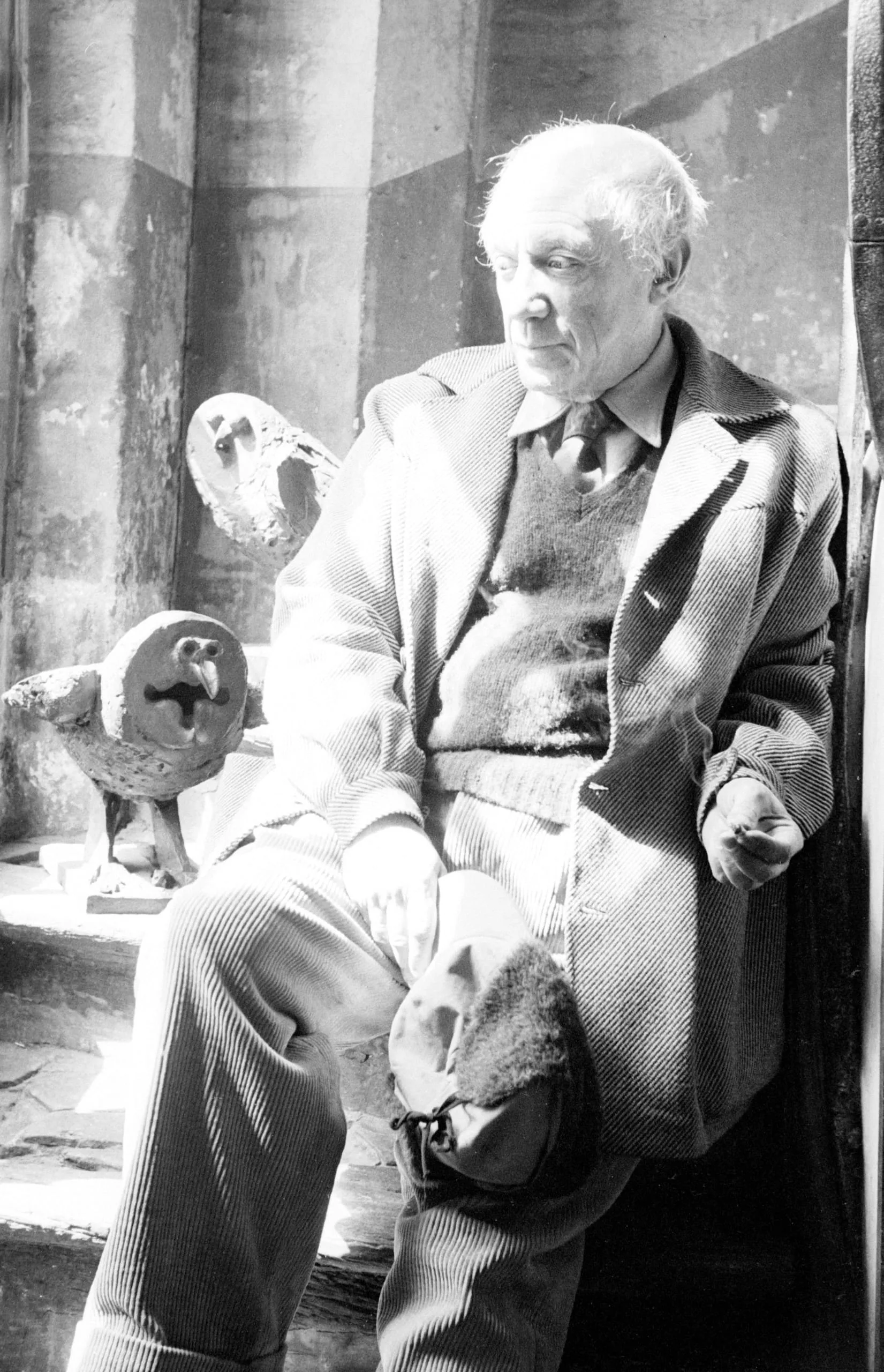 Black and white photograph of an elderly man seated beside two rough plaster owl sculptures, wearing a corduroy blazer and holding a cigarette