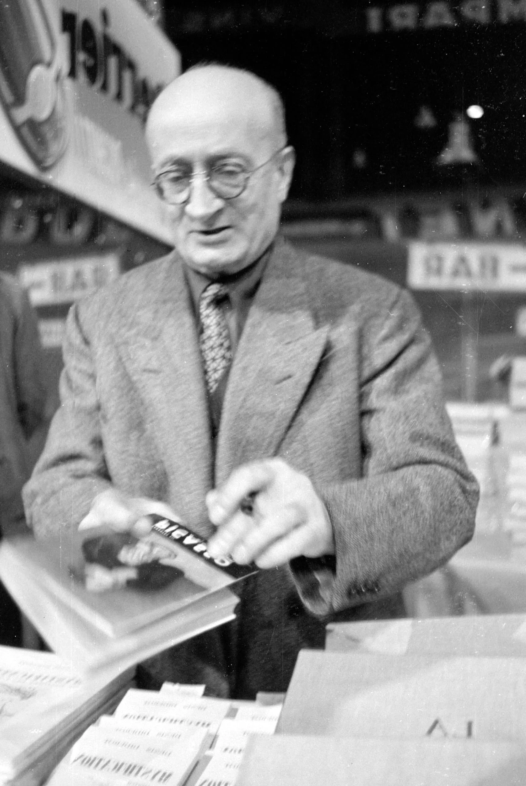 Black and white photograph of a bald man with round glasses leaning over a counter stacked with printed publications, handling a slim booklet
