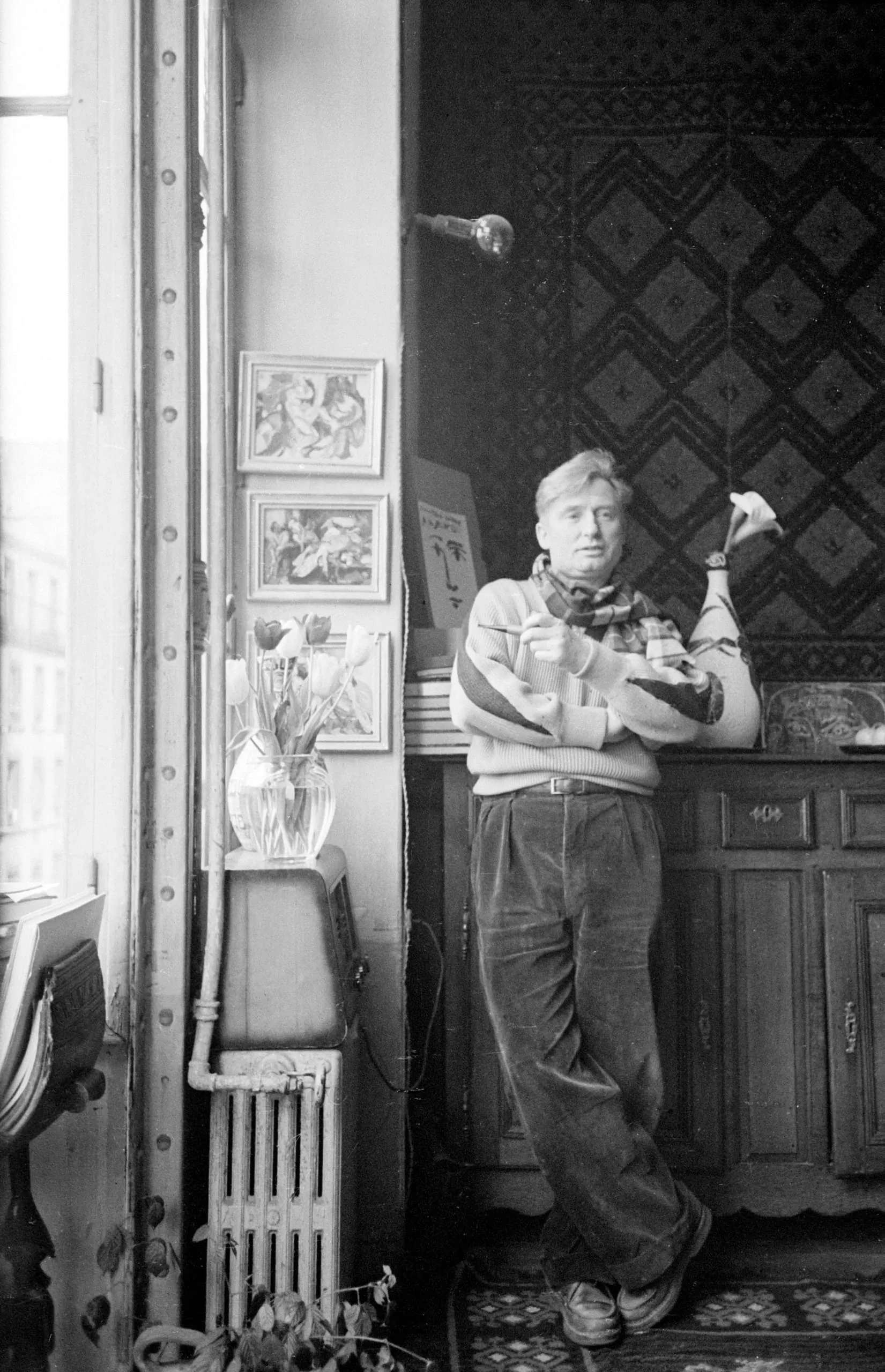 Black and white full-length photograph of a white man with short light hair leaning against a wooden cabinet in an interior room, arms crossed, holding a small white object