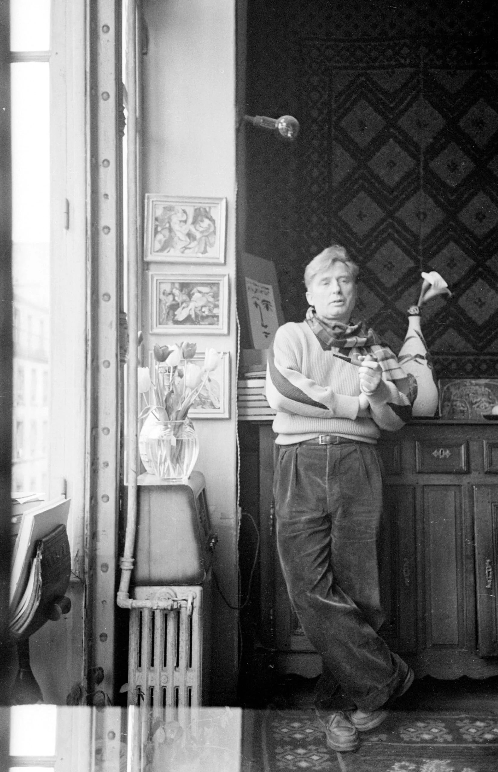 Black and white photograph of a man standing in a furnished interior, leaning against a dark wooden dresser, head tilted back, holding a small object, with framed works and a flower vase visible behind him