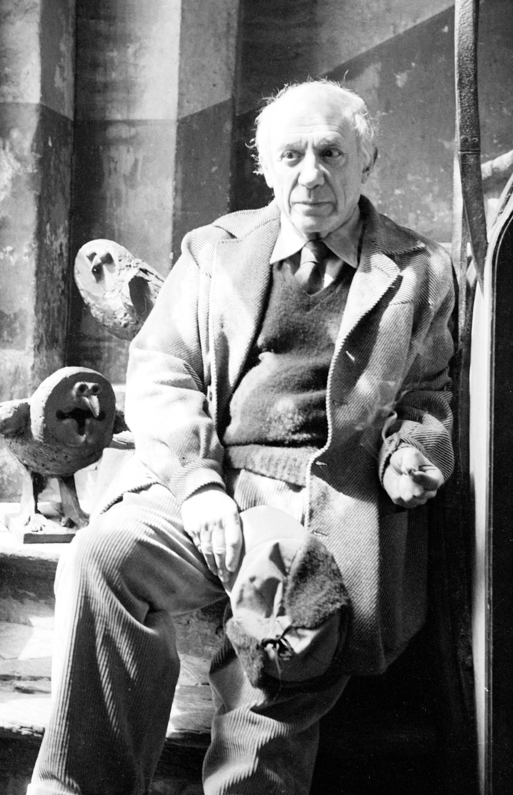 Black and white photograph of an elderly white-haired man seated facing the camera, wearing a corduroy blazer and tie, with rough bird-form sculptures visible to his left