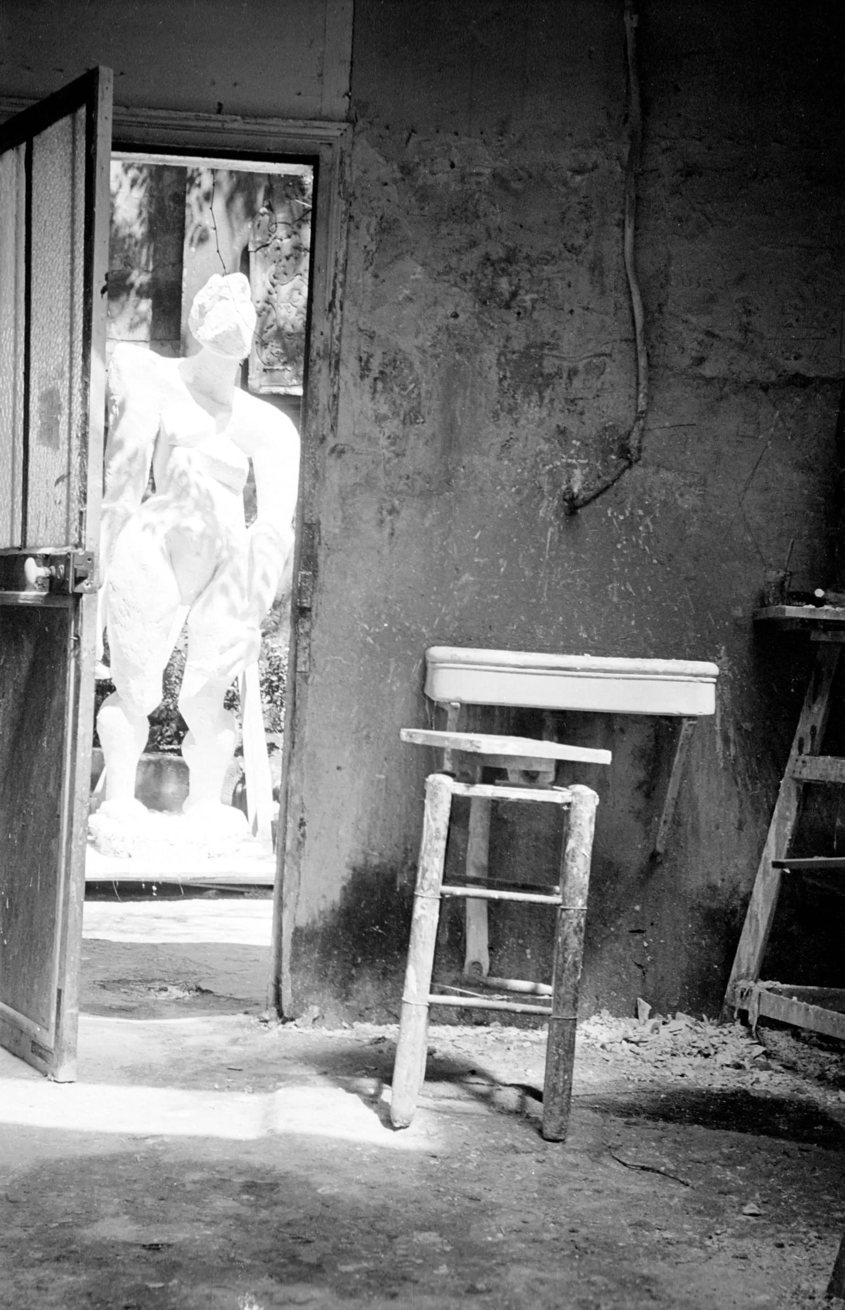 Black and white photograph of a dark studio interior with an open door revealing a bright white figurative sculpture outdoors, a utility sink and worn stepladder visible inside