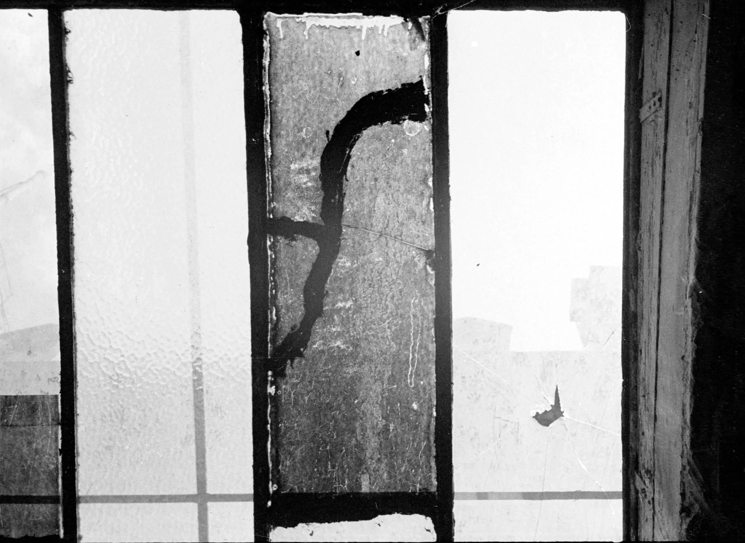 Black and white photograph looking through a grime-streaked, multi-paned window, with a thick black painted or tarred mark curving across the central pane against bright exterior light