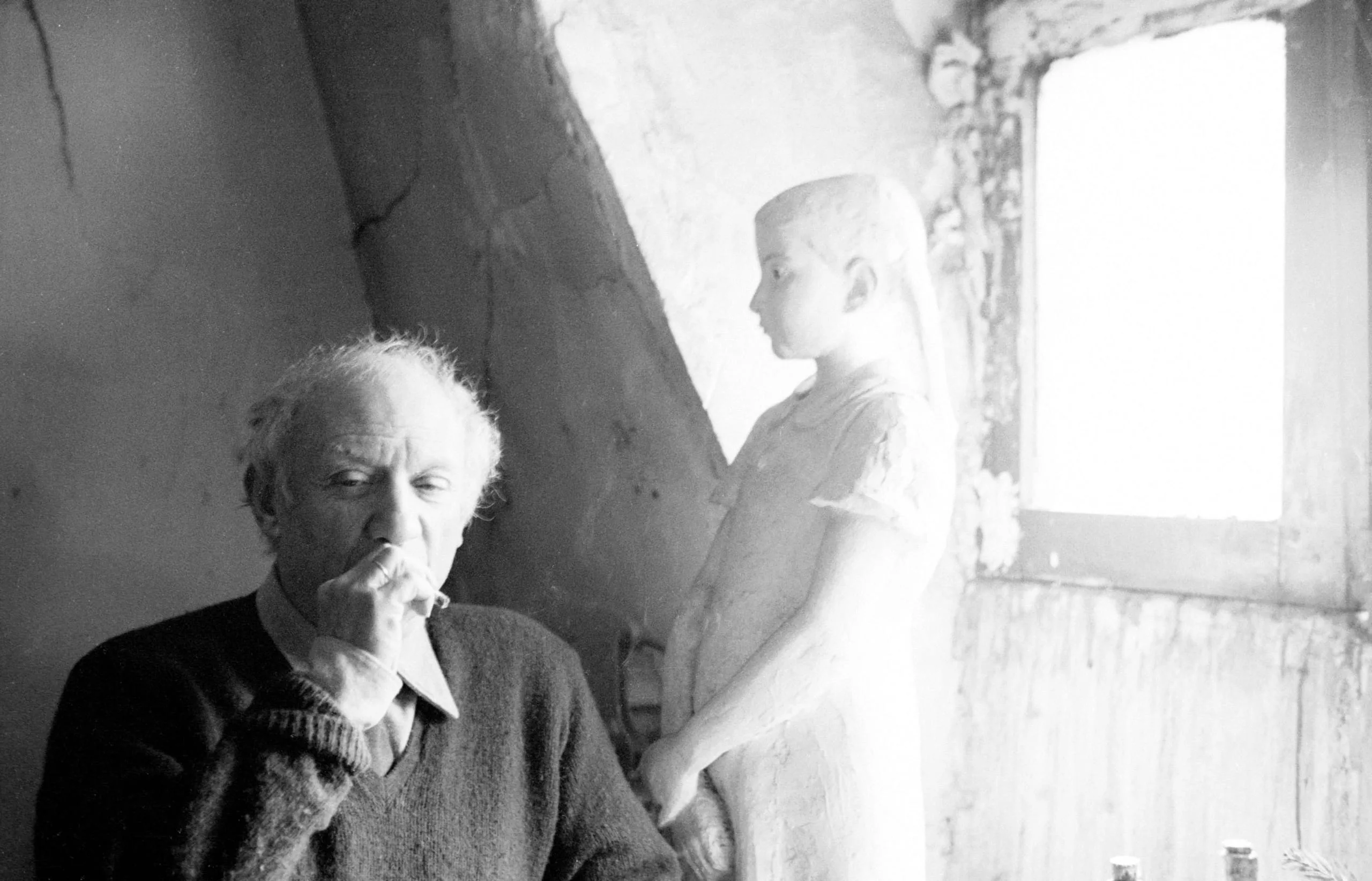 Black and white photograph of an older man with white hair, hand raised to his lips, seated beside a pale stone sculpture of a young girl in a cluttered studio