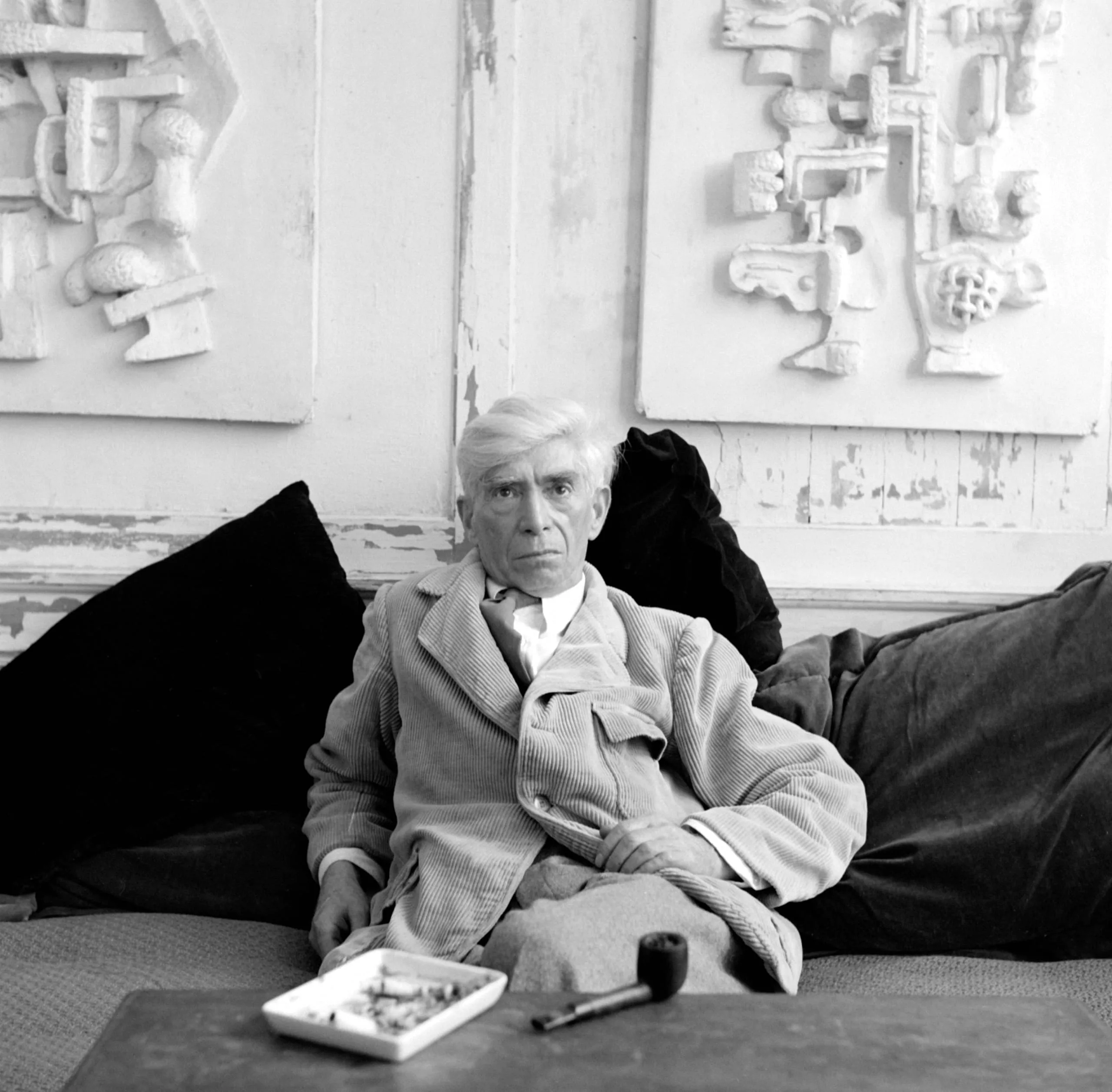 Black and white photograph, an older white man with pale hair seated on a dark sofa, arms crossed, surrounded by white relief sculpture panels on a peeling painted wall