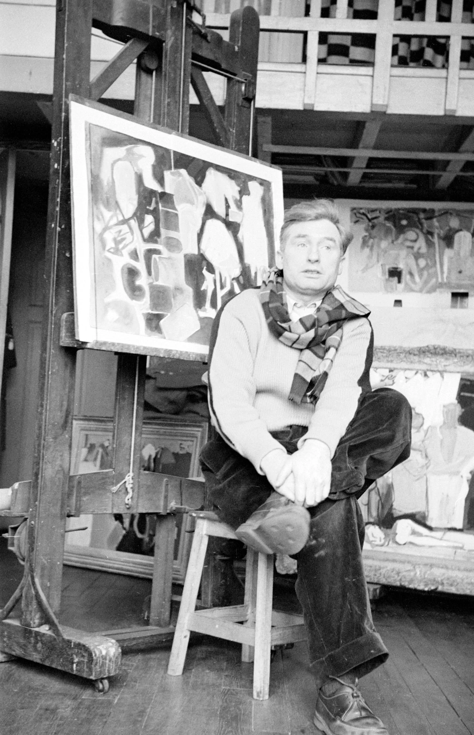 Black and white photograph of a man seated on a stool in an artist's studio, surrounded by paintings and a large wooden easel