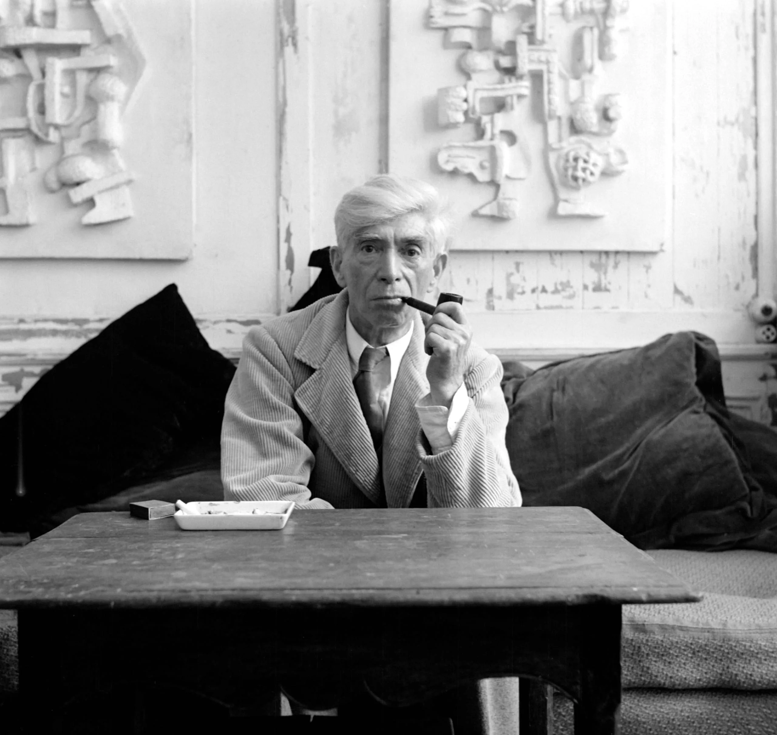 Black and white photograph of an older white man seated at a worn wooden table, holding a pipe to his lips, with abstract white relief sculptures mounted on a peeling wall behind him