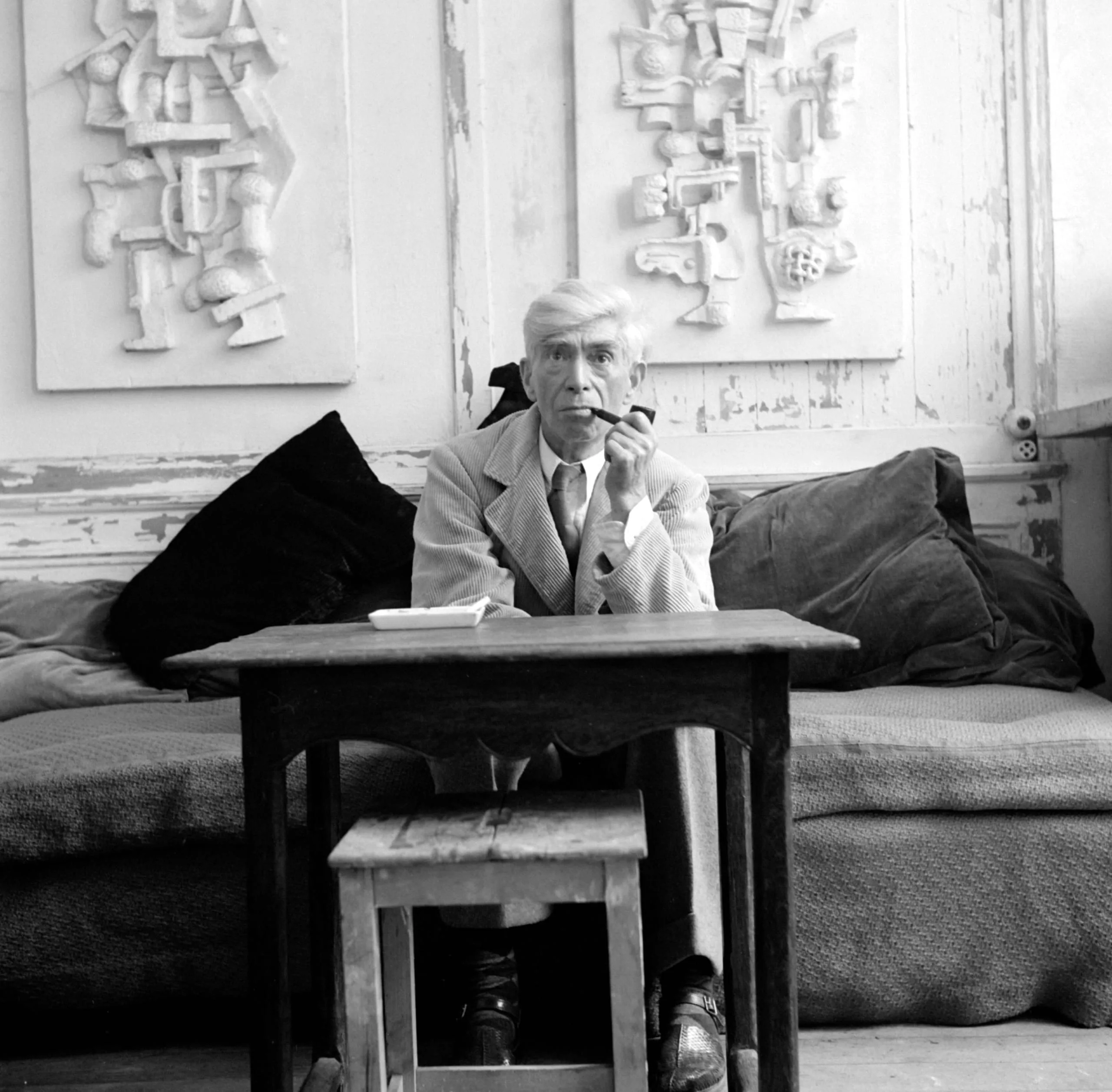 Black and white photograph of a white man with short white hair seated behind a small wooden table, holding a pipe, with two white relief sculptures mounted on a peeling wall behind him