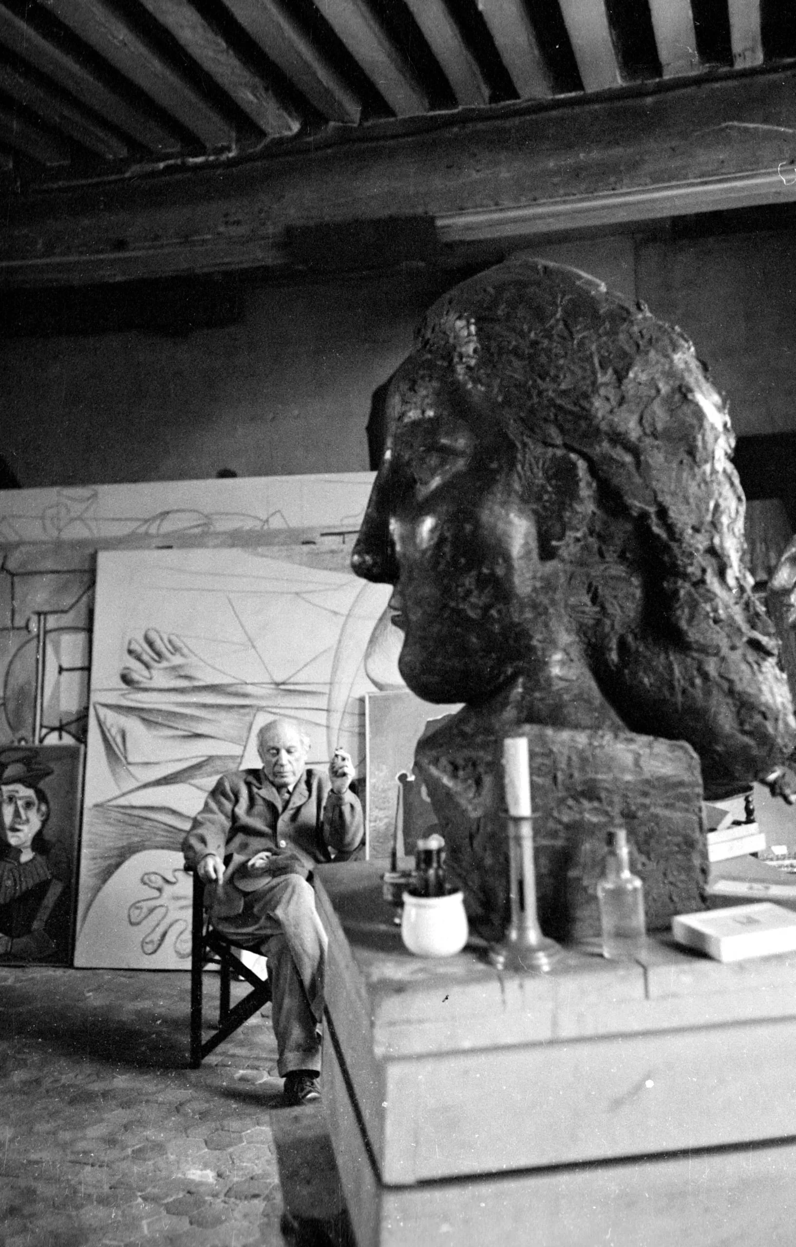 Black and white photograph of a bald, older white man seated in a studio chair beside a monumental bronze or clay portrait bust shown in profile, with large canvases stacked in the background