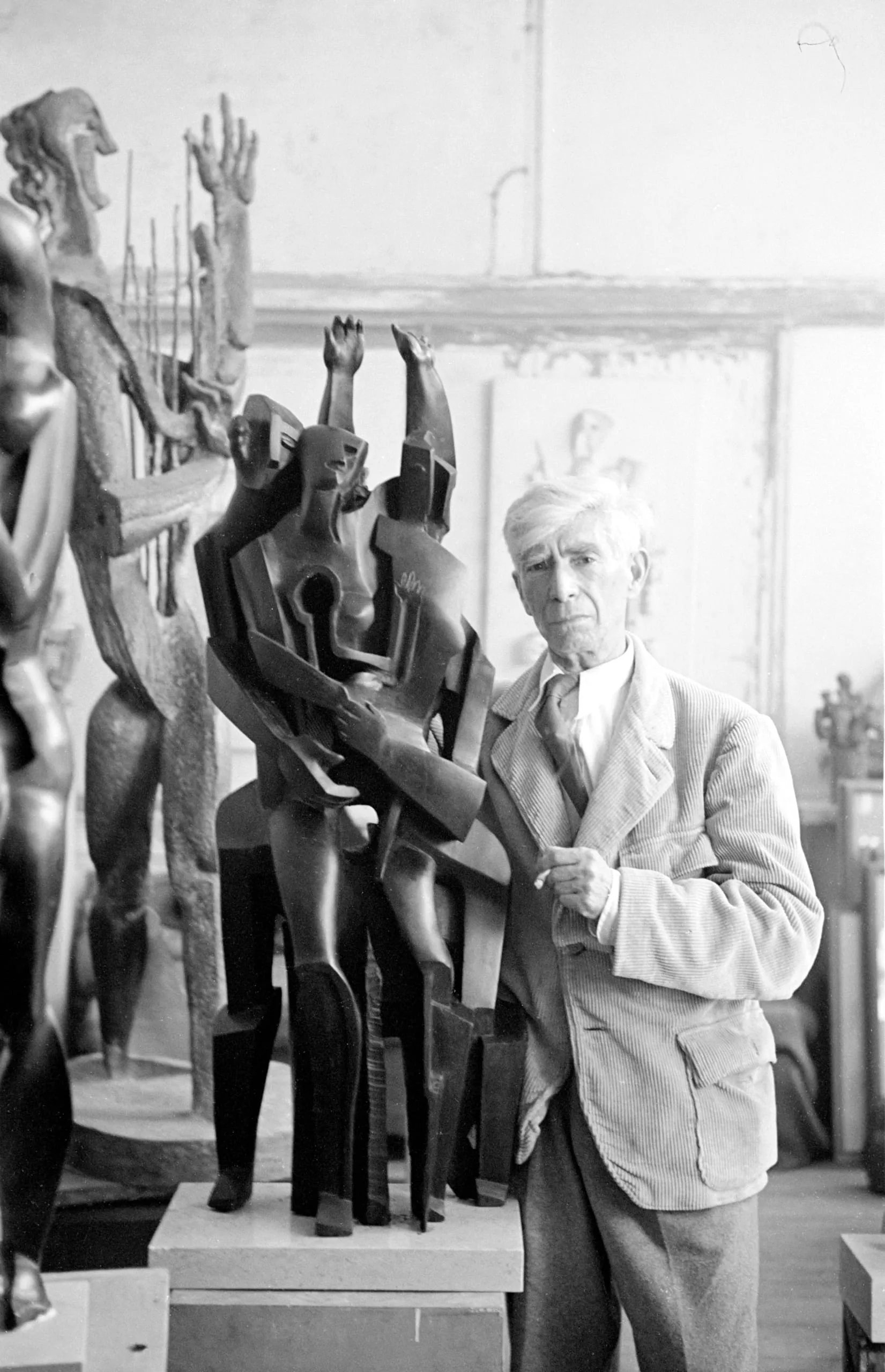 Black and white photograph of a white-haired man in a blazer standing among dark, abstracted figurative sculptures in an artist's studio