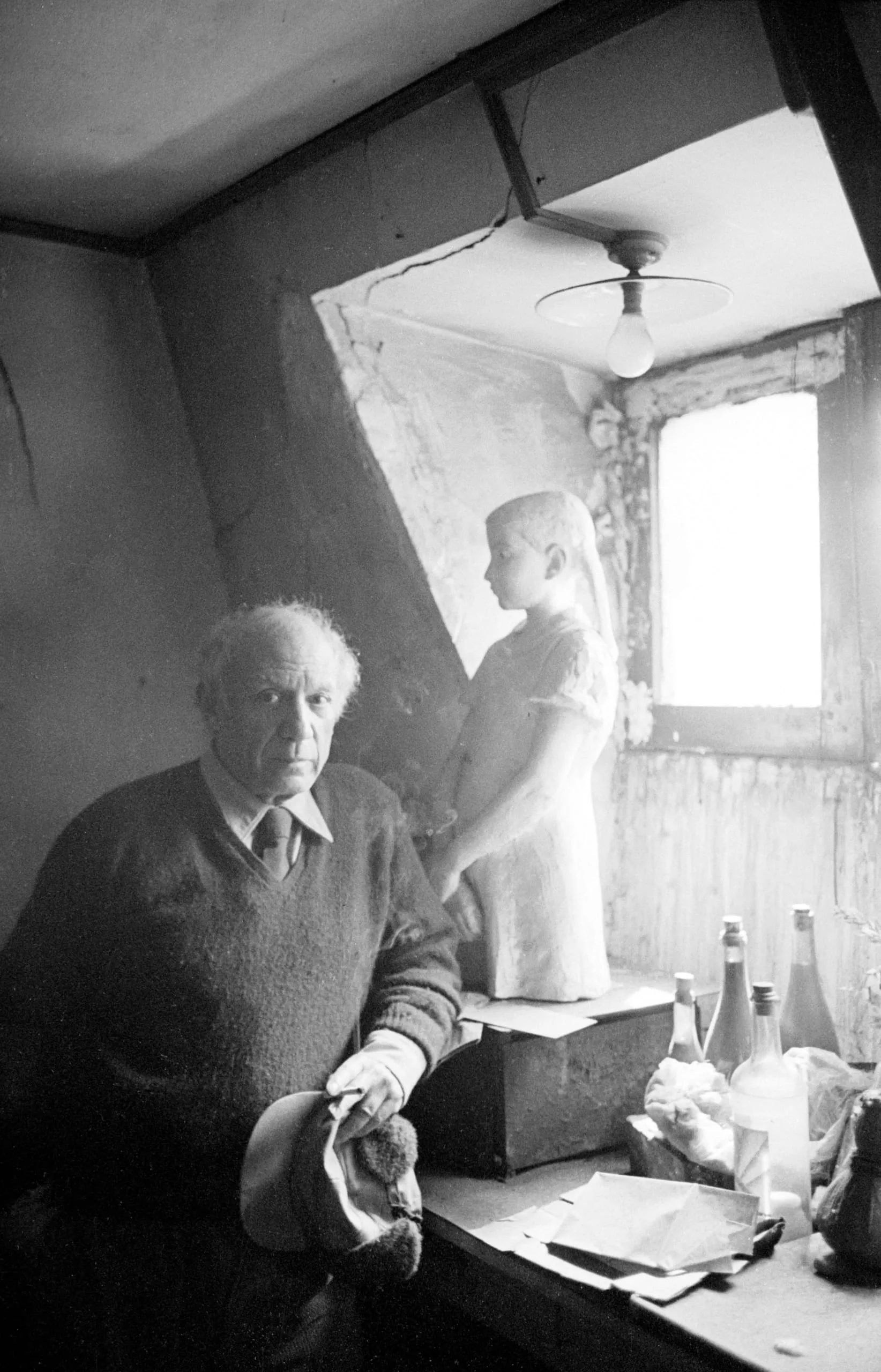 Black and white photograph of an older white man in a V-neck sweater standing in a dimly lit studio, a pale child bust sculpture visible near a bright window behind him
