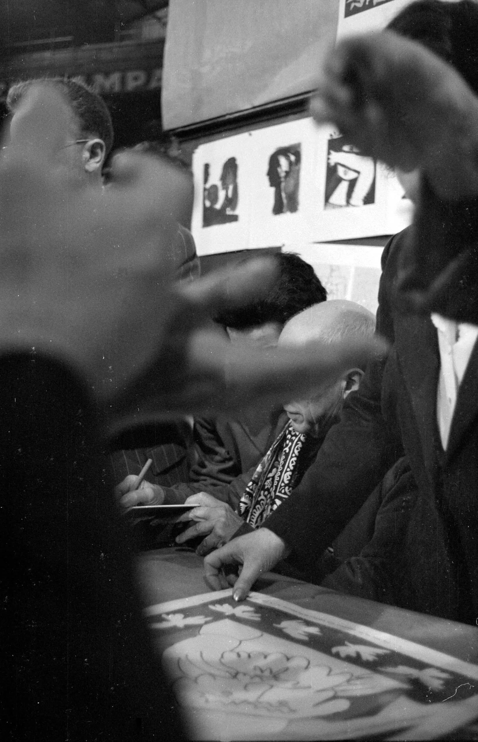 Black and white photograph, a bald man leans over a table pointing at a large floral drawing while others crowd around him, framed prints visible on the wall behind