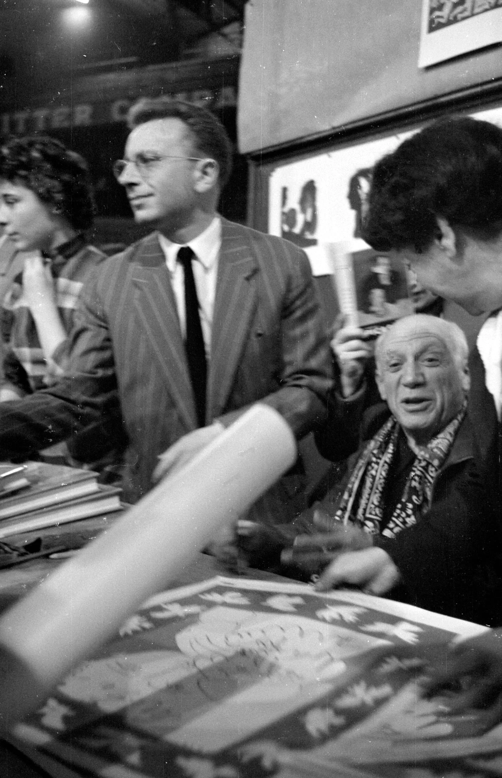 Black and white photograph of several people gathered around a table covered with books and prints at an indoor event, with a seated older bald man at center