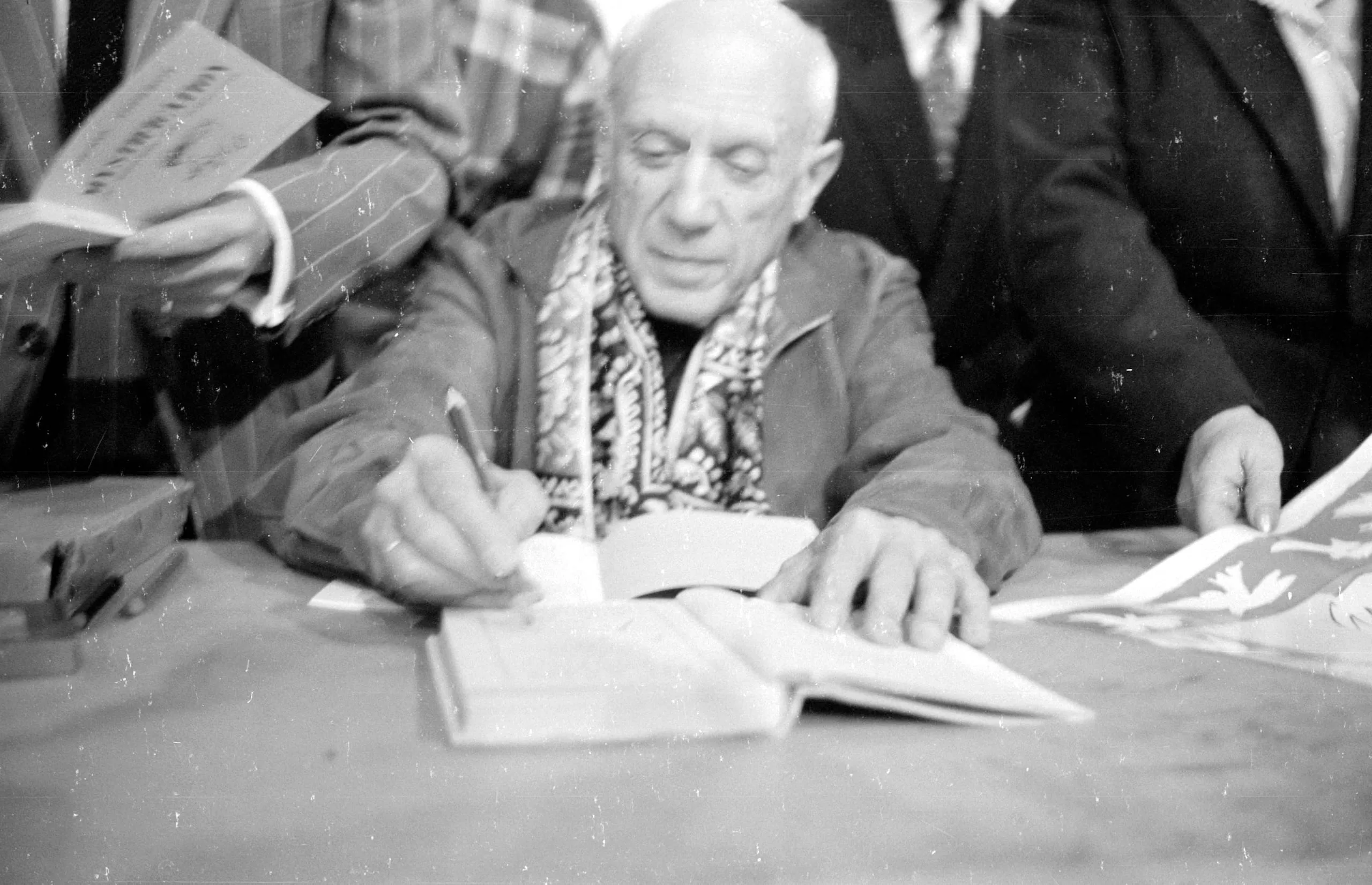 Black and white photograph of an older bald man in a jacket and patterned scarf, leaning over a table to sign an open book, surrounded by partially visible figures