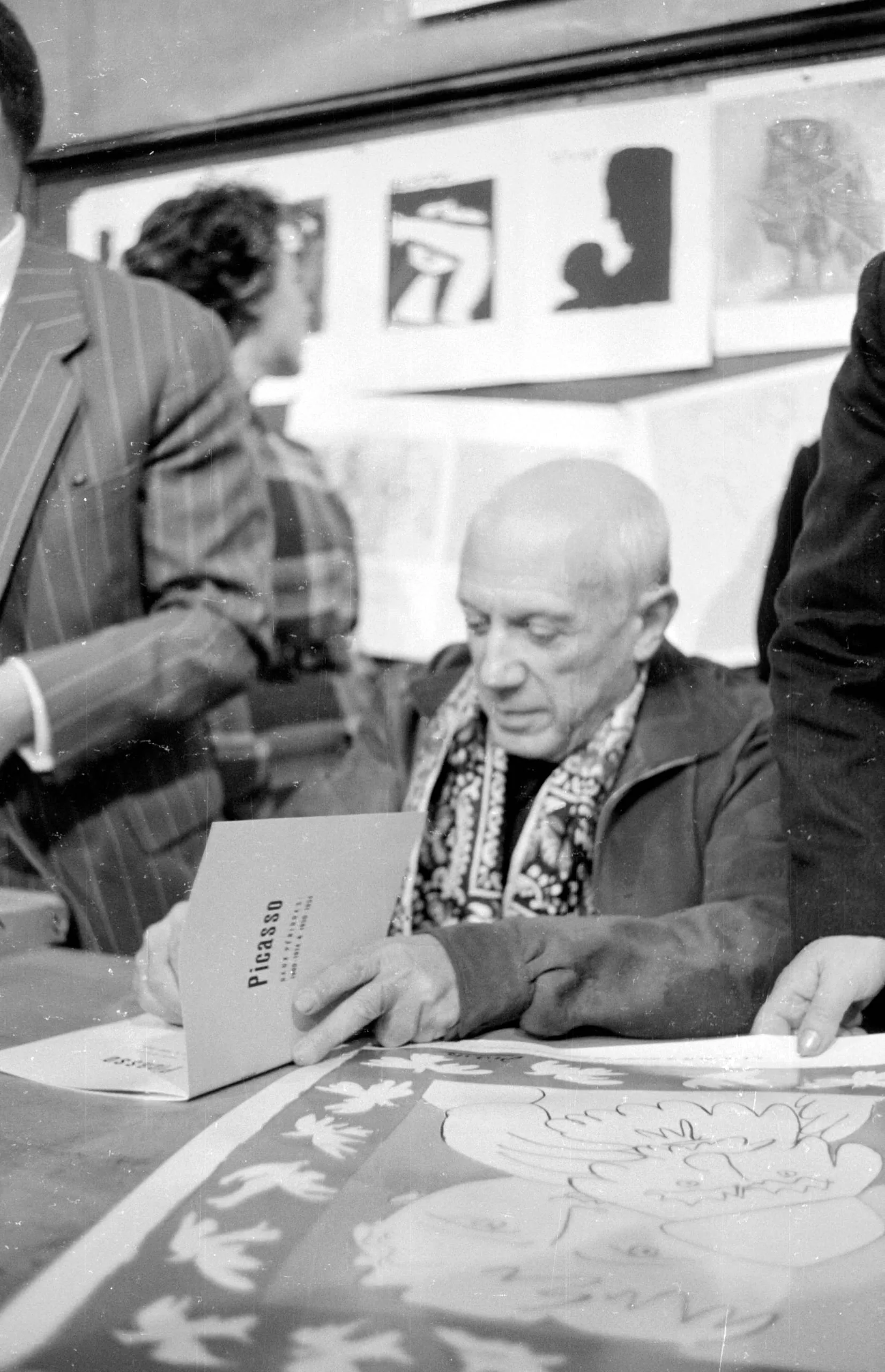 Black and white photograph of an elderly bald man seated at a table, leaning over an open booklet labeled "Picasso," with a large print visible on the table before him