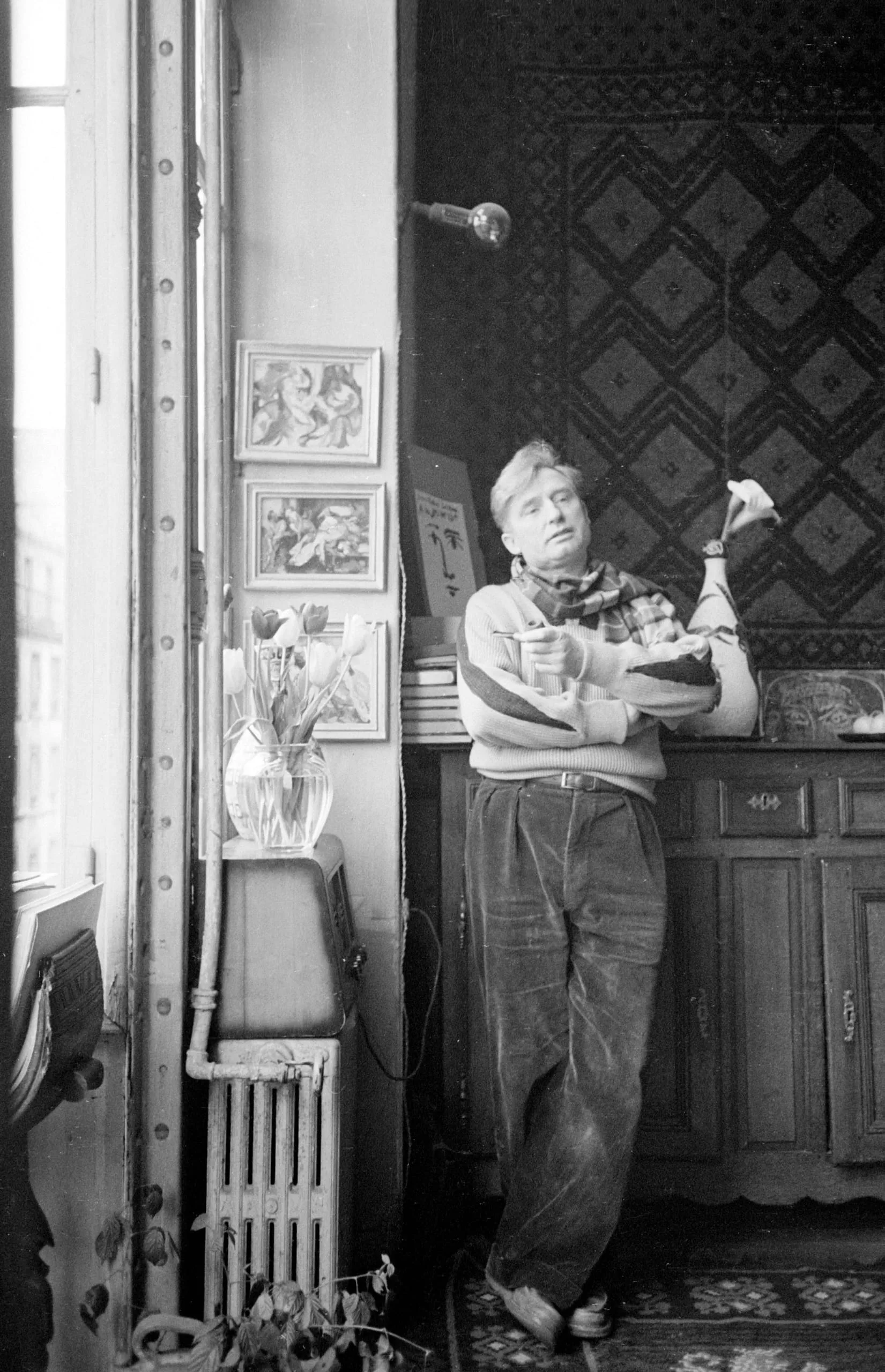 Black and white photograph, full-length portrait of a person leaning against a wooden cabinet, holding a small white bird, in a room with framed artwork, tulips in a vase, and patterned wallpaper