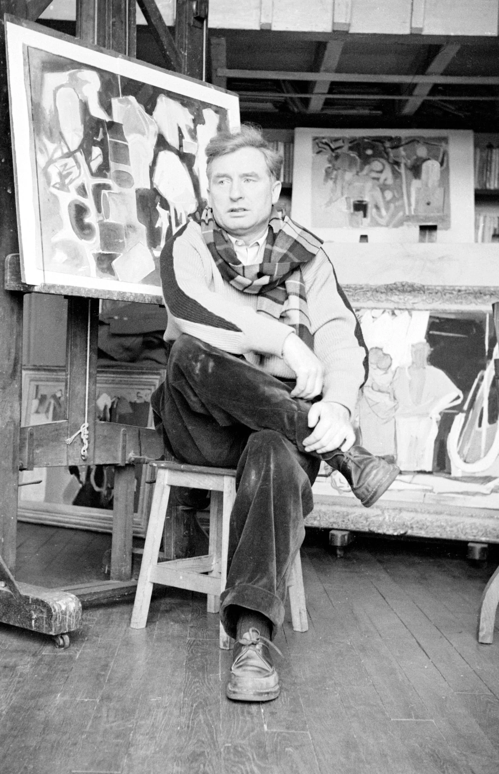 Black and white photograph of a man seated on a stool in an artist's studio, surrounded by large abstract paintings, wearing a vest over a plaid shirt