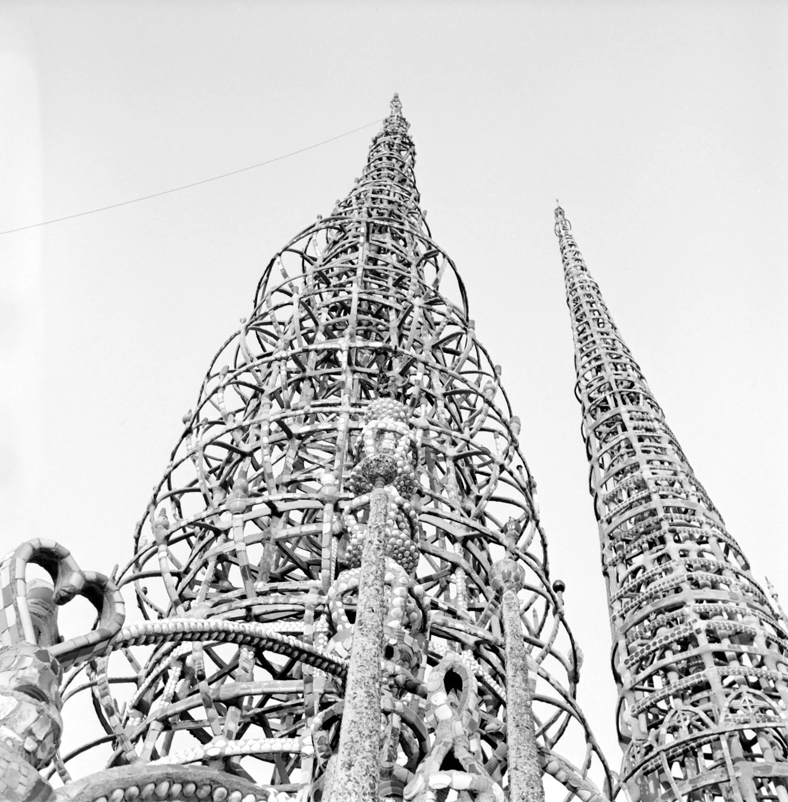 Black and white photograph looking sharply upward at two towering open-lattice spires covered in embedded tile and shell fragments against a pale sky