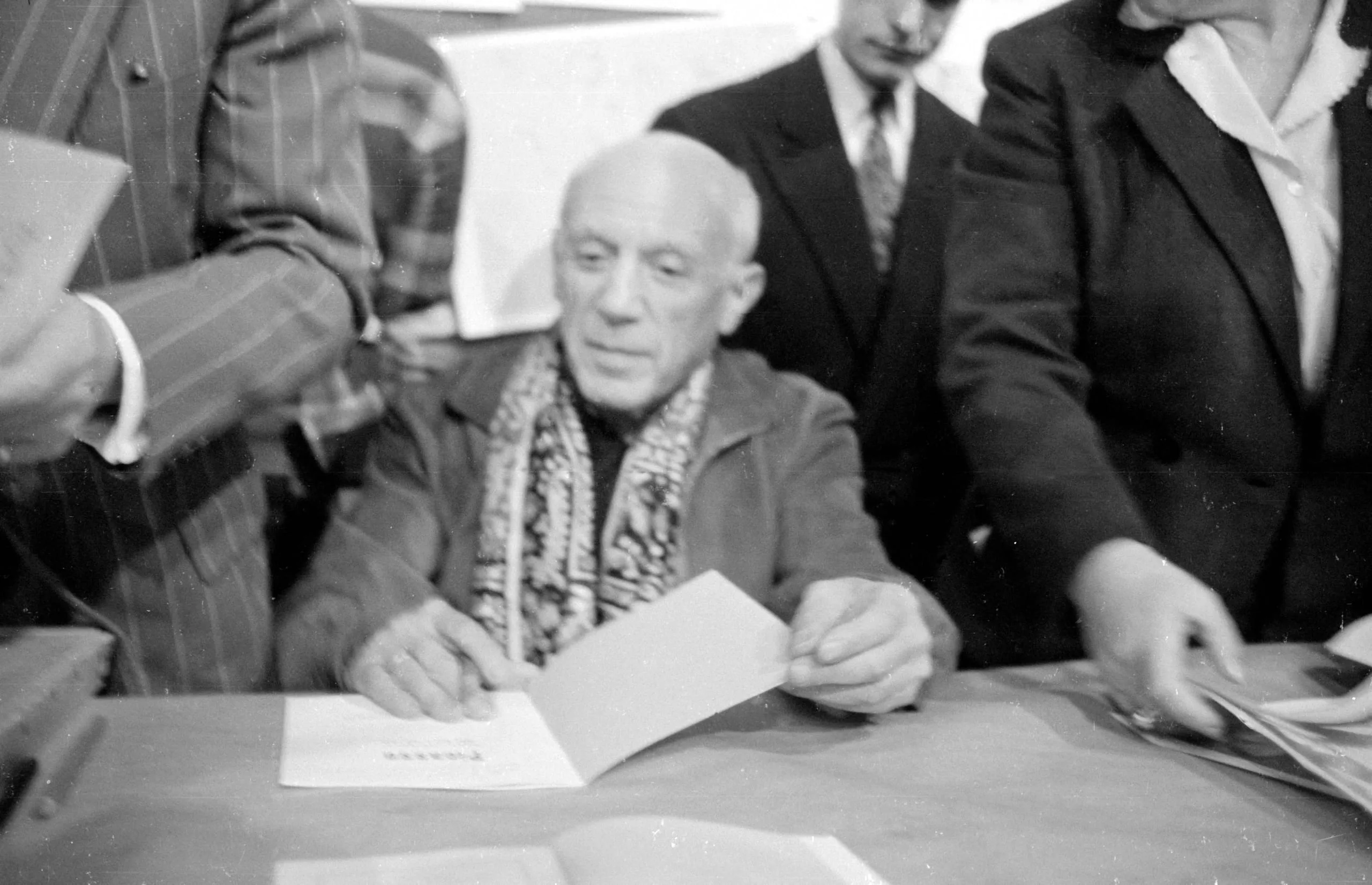Black and white photograph of an older man seated at a table with papers, surrounded by standing figures, soft diffused light