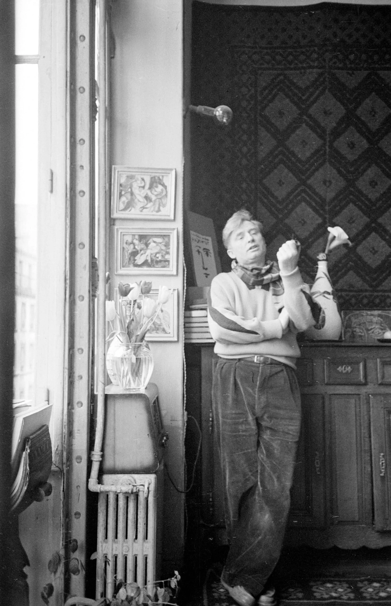 Black and white photograph of a young man standing in a studio interior, head tilted back with eyes closed, holding a small object, lit from a window at left