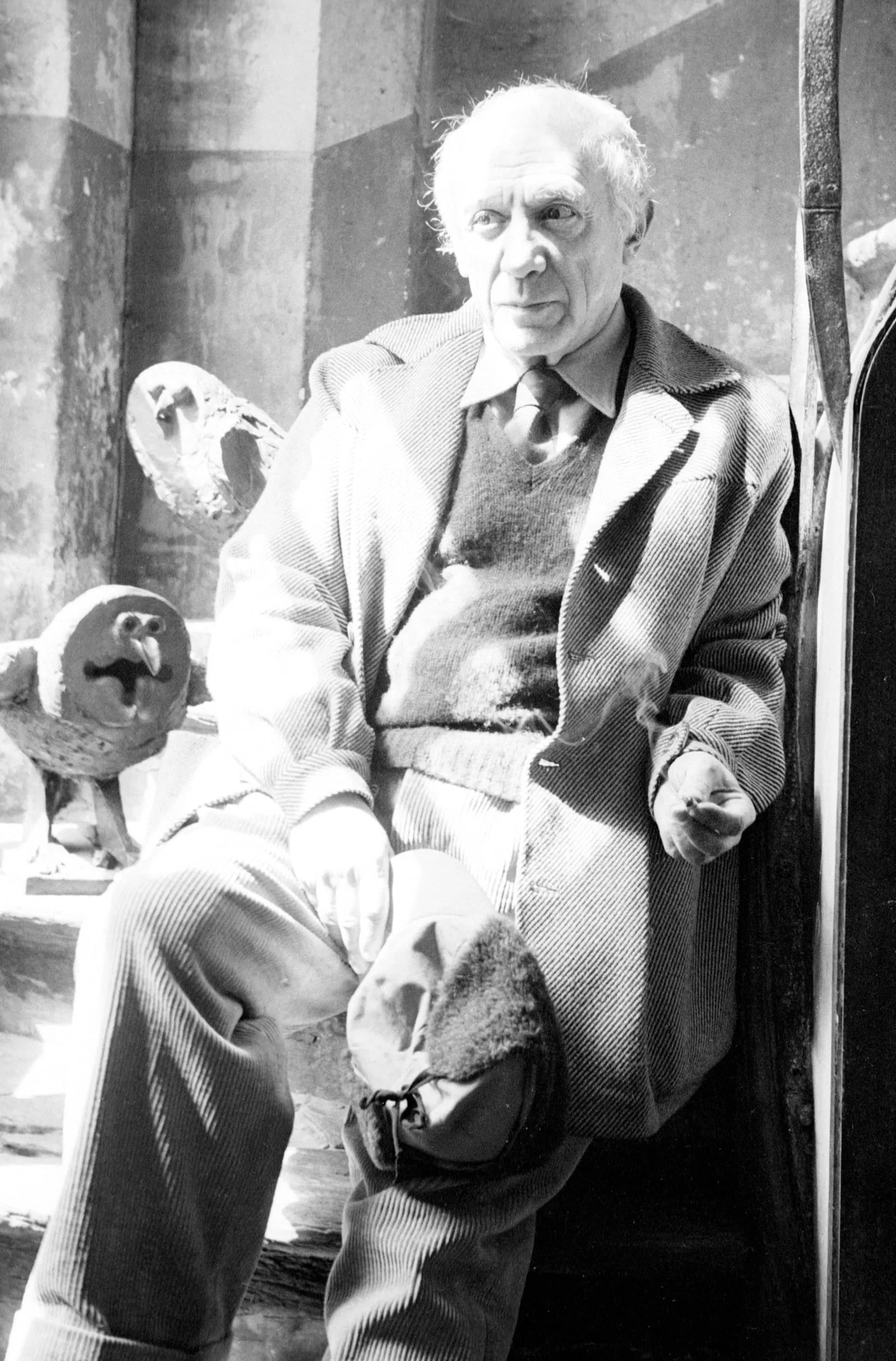 Black and white photograph of an elderly white-haired man in a corduroy blazer seated with legs crossed, beside a rough ceramic owl sculpture