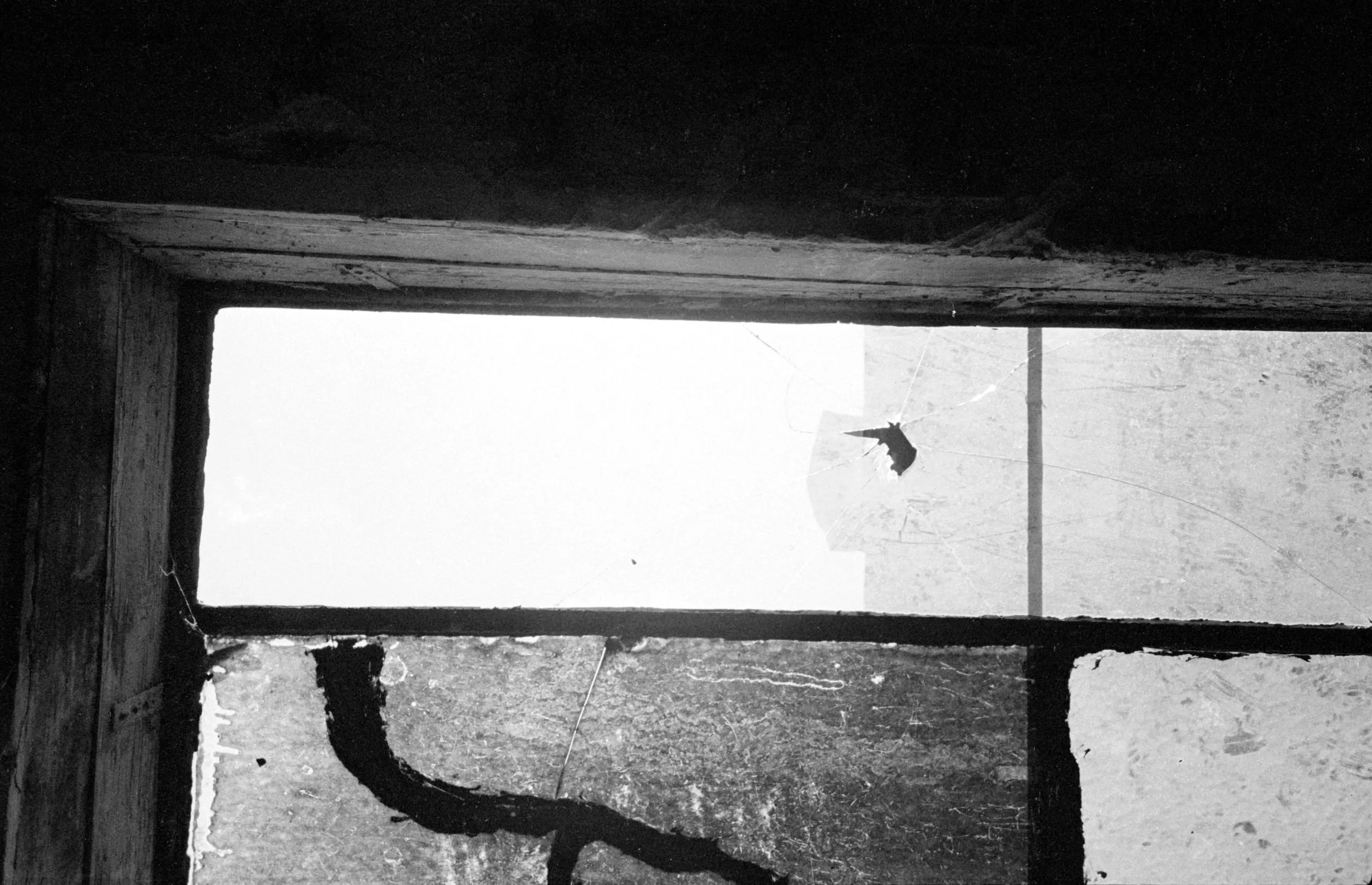Black and white photograph of a weathered multi-pane window from inside a building, with bright exterior light, a broken upper pane, and grime-coated lower glass