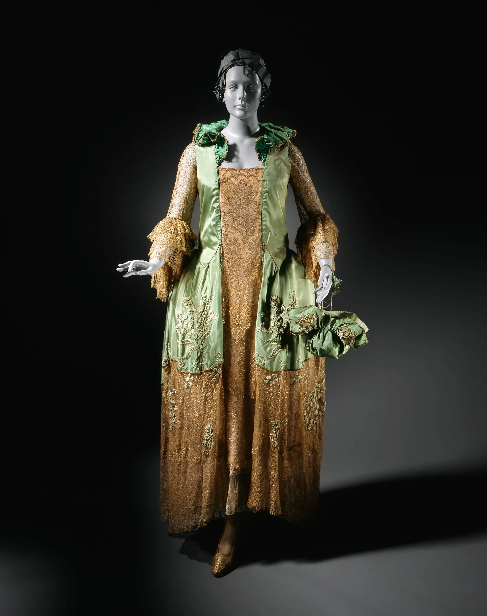- Dress: silk plain weave (taffeta) with silk and metallic-thread lace, silk plain weave (crepe chiffon), and silk and metallic-thread