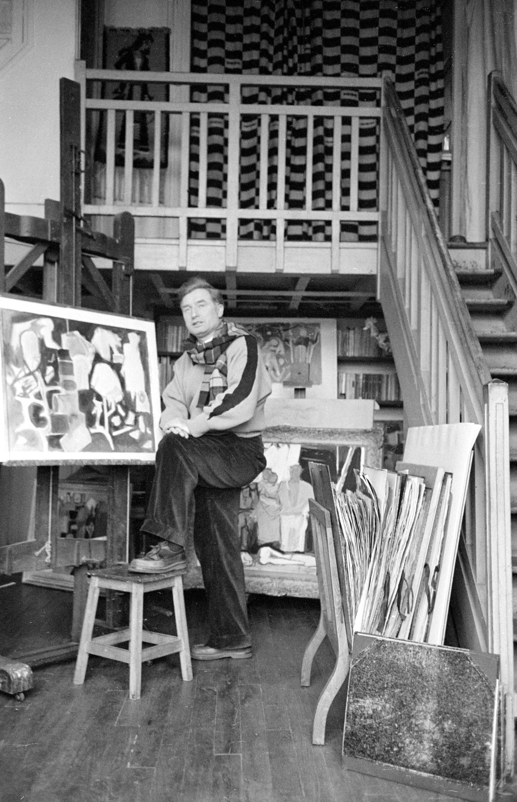 Black and white photograph of a man seated on a wooden stool in an artist's studio, surrounded by paintings, an easel, and a bold patterned textile hanging above