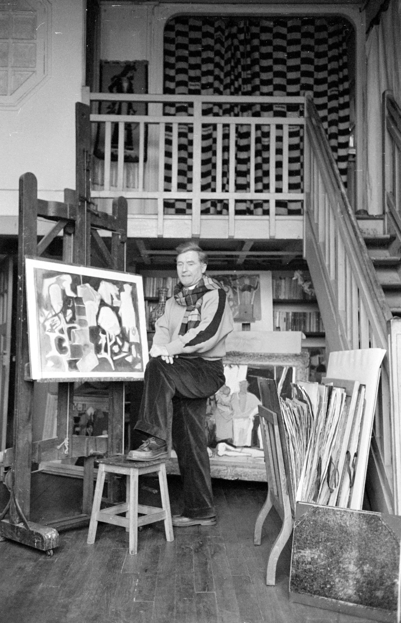 Black and white photograph of a man seated on a stool in an artist's studio, surrounded by canvases, an easel with a painting, and a bold checkered textile hanging above a staircase