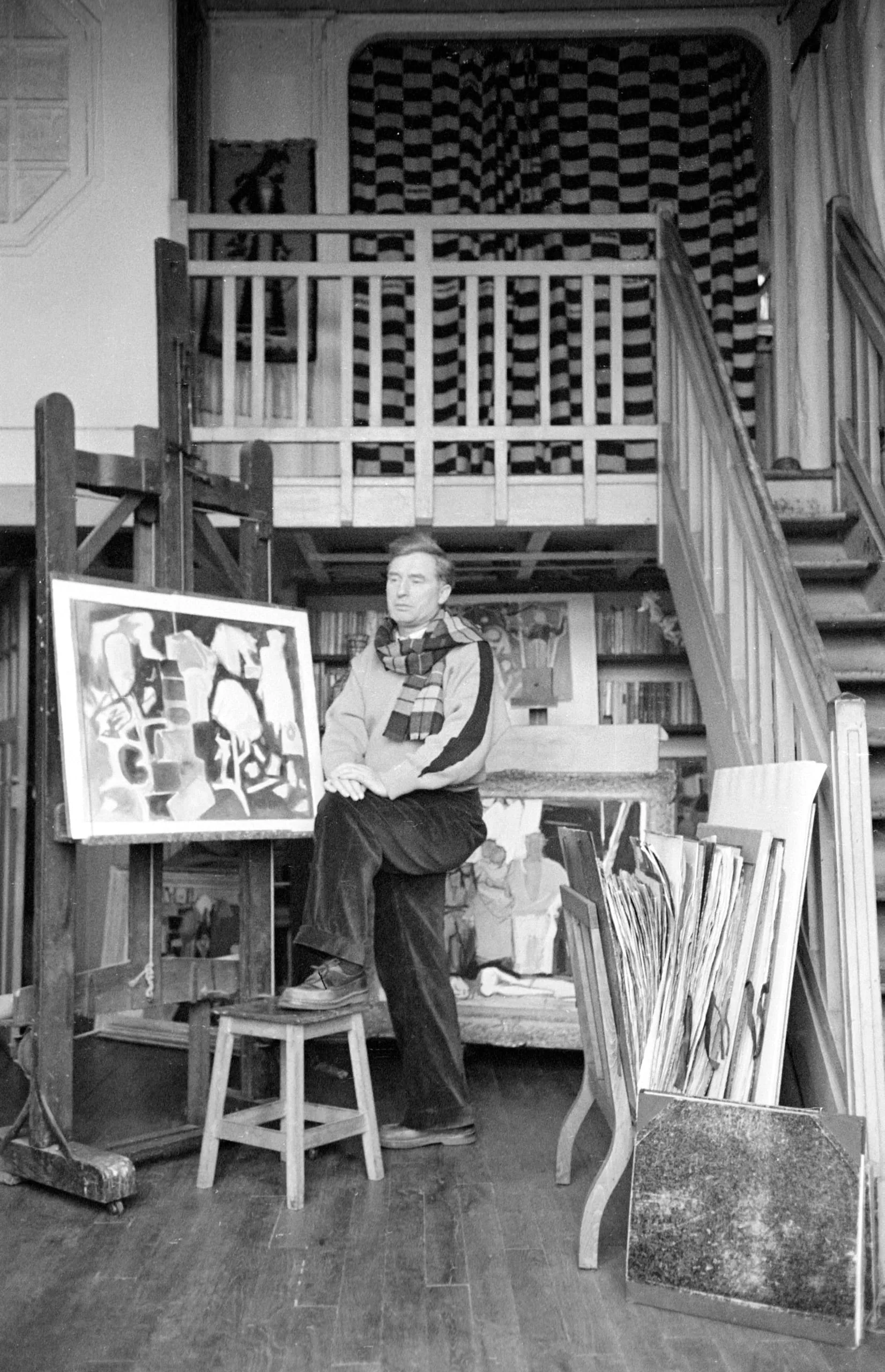 Black and white photograph of a man seated on a stool in an artist's studio, beside a painted canvas on an easel, with stacked artworks and a staircase behind him